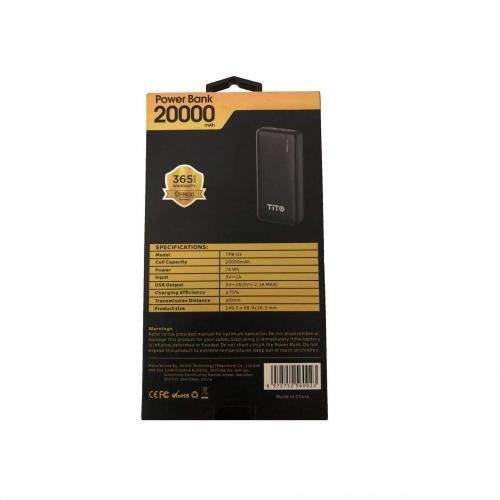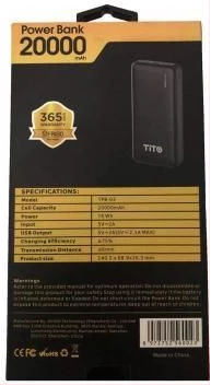 Key Features: Tito 20000mAh Powerful Portable Power Bank – Black Portable Powerful Type-C output Cell Capacity: 20000mAH Power: 74Wh