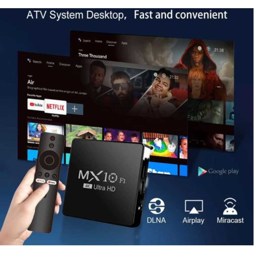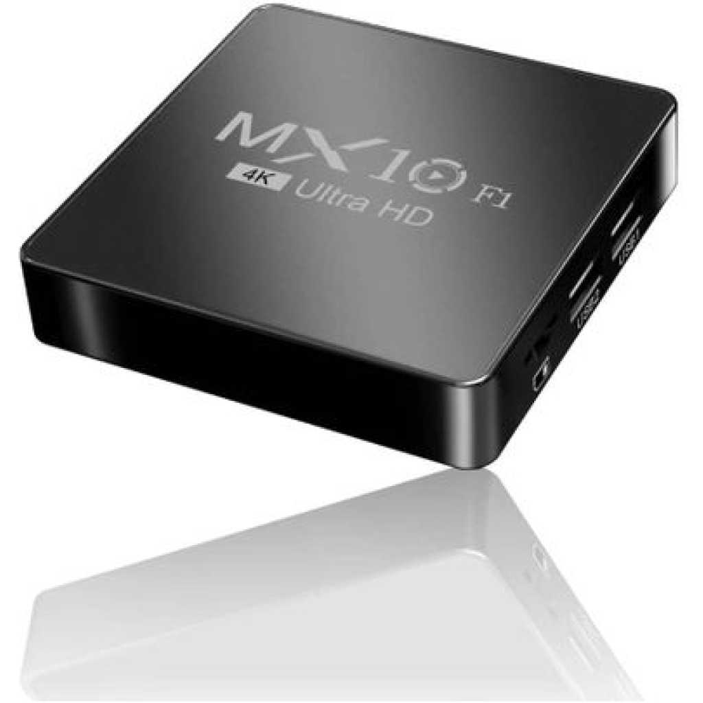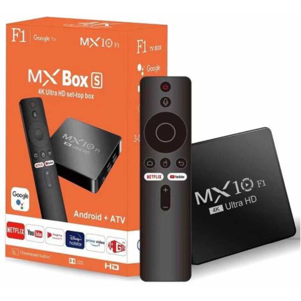 4K Ultra HD Image Quality: 4K Ultra HD realizes a more detailed and vivid image for you to immerse yourself in. 360° Bluetooth & IR Remote Control: The intuitive button layout and Bluetooth allows you to access your favorite content much quicker from any angle. Voice Control “Ok Google”: Your TV is more helpful than ever. Ask Google to find movies, stream apps, play music, and control the TV. Dolby Vision & HDR10+: A crisper image in any lighting condition. With Dolby Vision and HDR10+, images now feature a higher dynamic range, and have more amazing brightness, contrast and color than before. HDR images also have more detailed shadows and highlights. Dolby Atmos & DTS-HD: Extraordinary audio experience. As revolutionary spatial audio technology, Dolby Atmos brings the ultimate cinema experience into your living room by surrounding you with powerful sound effects, and also, DTS-HD delivers extraordinarily high-quality sound. Powerful Processor: Accelerated experience: The quad-core CPU delivers efficient performance. With high-performance GPU, the TV can now become your new entertainment platform. The 2GB RAM + 8GB ROM combo offers a smoother viewing experience. Google TV: Entertainment you love, with a little help from Google. Google TV brings together movies, shows, and more from across your apps and subscriptions and organizes them just for you. Discover new things to watch with recommendations based on what you watch and what interests you, from across your subscriptions and content available to you. MX10 Android TV Box is waiting for you with its rich contents and unique features to take your smart home entertainment systems to the next level. ; With this powerful TV box with Android 7.1 operating system, watch all kinds of multimedia content in 4K resolution, play your games on the big screen and make your television smarter with numerous applications. ; Android 7.1: Up-to-date and user-friendly operating system for a stable and fast experience; 4k resolution: Watch your movies and videos in crystal clarity with cinema-quality images; Easy installation: It is easy and fast to install with the plug and play feature; Multi-purpose use: It offers Android TV, TV box, box, TV stick and smart TV features all in one; Maximize entertainment: Bring your favorite movies, TV series and live broadcasts directly to the comfort of your living room; Gaming enjoyment: Increase your experience by playing games on a larger screen; Application support: Download and use the applications you want; Smart control: Control your TV box with your remote control or your smartphone; High connection options: Experience the best connection with HDMI, USB ports and Wi-Fi connection. What’s in the box 1 x 4K Android Wifi Smart TV Box 1 x Connect Cable 1 x Charger Cable 1 x Remote 1 x Manual
