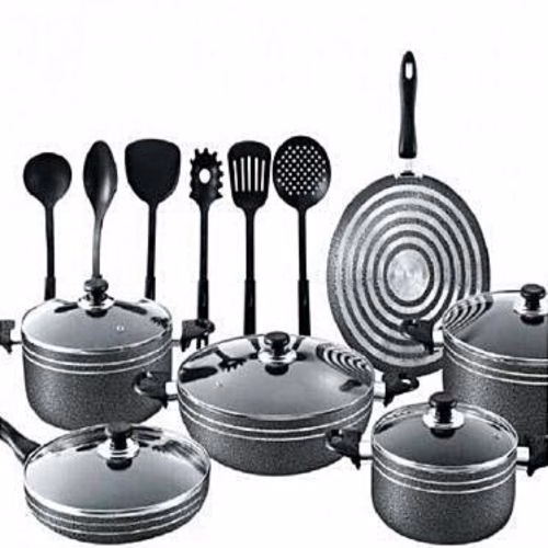 Key Features: Die-cast coating Heavy gauge aluminum is super conductive for even heat distribution Easy clean exterior Bakelite handles Transparent lids with steam outlet holes 4 pcs nonstick cooking pots 5 pcs transparent glass lid 2 pc Frying pan 6 Non-stick spoons