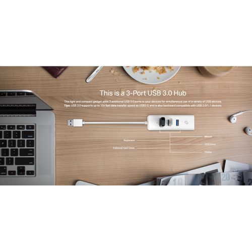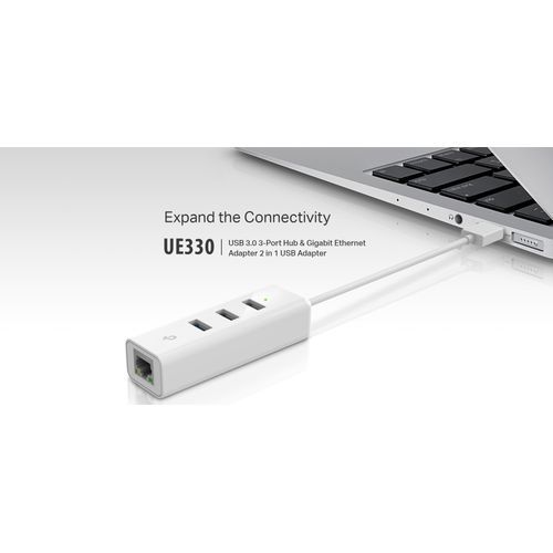 TP-LINK USB 3.0 3-Port Hub & Gigabit Ethernet Adapter – White Expand the Connectivity- USB 3.0 3-Port Hub & Gigabit Ethernet Adapter 2 in 1 USB Adapter UE330.This is a 3-Port USB 3.0 Hub. This light and compact gadget adds 3 additional USB 3.0 ports to your devices for simultaneous use of a variety of USB devices. Tips: USB 3.0 supports up to 10x fast data transfer speed as USB 2.0, also backward compatible with USB 2.0/1.1 devices. This is also a Gigabit Ethernet Adapter. Meanwhile, this light and compact gadget adds Gigabit Ethernet network connectivity to your Ultrabook, Chromebook, laptop, or desktop, ensuring you up to 1000Mbps reliable wired network connection. Carry One That Equals Two Performance: UE330 = 3-Port USB 3.0 Hub + USB 3.0 to Gigabit Ethernet Adapter Size: UE330 = USB 3.0 to Gigabit Ethernet Adapter Unpack and Ready to Use No More Driver Installation This user friendly gadget supports Plug and Play feature that enables user to use it by simply connecting it to an available USB port without manual driver installation Enhanced Stability & Compatibility Utilizing advanced chipset solution, this reliable gadget ensures you fast and stable