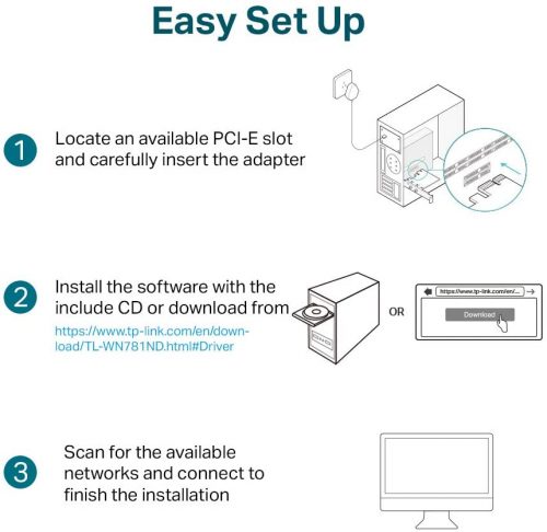 TP-LINK TL-WN781ND is designed to provide a complete end-to-end wireless performance from the server or server backbone to the switch infrastructure and down through to the desktop with the PCI Express connector. TL-WN781ND Wireless N PCI Express(x1) Adapter provides a wider compatibility, fitting with any standard PCI Express slot, x1, x2, x8, or x16. Compared with standard PCI network cards, it offers increased bandwidth, reliability and more functionality, allowing you to enjoy a fast and advanced connection, such as downloading, making internet call and video streaming. Wireless N -Speed & Range. Complying with the IEEE 802.11n standard, TL-WN781ND can easily establish a wireless network and get up to 9X the speed and 4X the range of conventional 11g products. Compared with legacy 54M products, TL-WN781ND delivers performance enhancements, allowing you to have a more joyful surfing experience, including sharing files, watching streaming media. WPA/WPA2 Encryptions – Advanced Security. As for the security of WI-FI connection, WEP encryption has been no longer the strongest and safest guards for outside intrusions. TL-WN781ND provides WPA/WPA2 encryptions that are created by the WI-FI Alliance industry group, preventing the wireless network from outside threats. Quick Setup Security. Compatible with WI-FI Protected Setup (WPS), TL-WN781ND features Quick Security Setup (QSS) function, which is ideal for creating a WPA encrypted connection to prevent outside intrusion, and meanwhile maximize the management resources. Detachable Antenna. TL-WN781ND offers external antenna that can be rotated and adjusted in different directions to fit various operation environments, and can bring better performance than the internal antenna. For even more demanding applications, the antenna can be replaced with diverse antennas to show even greater flexibility and wider wireless coverage. Frequency Range: 2.400-2.4835GHz; Interface Available: PCI Express; System Requirement: Windows 8.1/8(32/64bits) Windows 7(32/64bits) Windows Vista(32/64bits) Windows XP(32/64bits); Wireless Standards: IEEE 802.11n IEEE 802.11g IEEE 802.11b