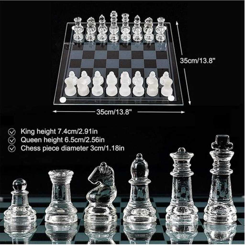 Key Features: SET INCLUDES One high-quality glass chess board with 16 frosted pieces and 16 clear pieces. Featuring the classic Knight, Rook, Bishop, Queen, King, and Pawns Crystal chess Board Set that looks super elegant and beautiful on your living room table. The transparent design matches perfectly with your home decor KID FRIENDLY STRATEGY GAME That develops critical thinking skills as well as teaches good sportsmanship A GAME OF WITS that you can play with your friends and family! Challenge mom and dad at your next family game night HIGH QUALITY novelty chess set that is simply a step above the rest. Each piece is made with premium glass and felt pads in order to keep your furniture scratch-free