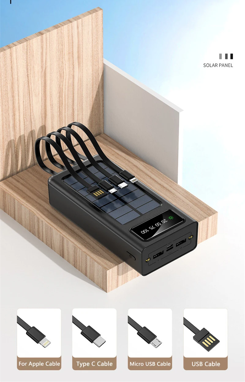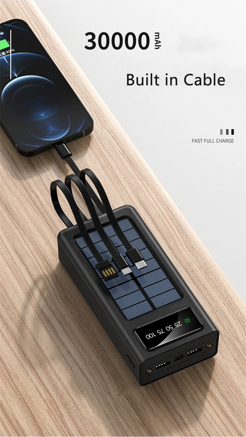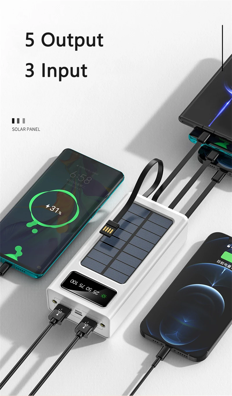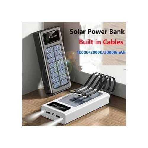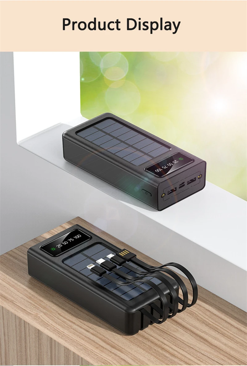 30000mAh/20000mAh/10000mAh Solar Power Bank Built in Cable Portable Charger External Battery Pack for iPhone 14 13 Samsung Huawei Xiaomi Powerbank with LED Light Digital Display Specification: Item: Solar Powerbank Input: 5V/2.1A Output: 5V/2.1A Capacity: 10000 mAh / 20000mAh / 30000mAh Material: plastic ABS + TPU Weight: About 240g / 310g / 510g Color: White, Black, Suit for: for ipad, for iphone, for other brands of mobile phones, for PSP, MP3, MP4 and other digital products. Features: Support Solar Charging Support USB Charging Support 2.1A Fast Charging Built in 4 Cables Built in USB Charging Cable Built in Micro USB Cable Built in Type C Cable Built in for Apple Cable With Solar Panel With LED Digital Display With Dual LED Flashlight With Dual USB Output With Type C Input and Micro USB Input Package Included: 1 x Solar Power Bank 1 x Retail Box 1 x User Manual TAKE A LOOK AT THIS:30000mAh Solar Power Bank Built in Cable Portable Charger External Battery Pack for iPhone 14 13 Samsung Huawei Xiaomi Powerbank PRODUCT PROPERTY:✨ 1: Wst is a professional brand.The battery type is li-polymer battery.Our product belongs to portable power bank.The features of our product is with led lamp.The certification of our product is fcc.Our product is from cn(origin). ✨ 2: The shell material of our product is plastic.The input interface of our product is usb type c.The output interface of our product is usb-type c.The max input of our product is 10w.The support quick charge technology is two-way quick charge. REASONS TO BUY:✨ 30000 solar external battery: allow you to charge up your devices while still allowing you to enjoy maximum performance. ✨ Small and exquisite: the battery bank is small and compact, easy to carry. it can be placed in a pocket or backpack when not in use. ✨ High compatibility: the solar power bank is compatible with samsung, xiaomi, huawei, xiaomi and other devices. it can be used on android phones, tablets, laptops, computers, etc. ✨ Why choose this high-capacity camping mobile power bank (1)Awesome for outside activities such as camping, hiking, and other emergency use. (2)It makes it easy to charge five smartphones simultaneously at full speed. (3) 2 led lights can be used as flashlight. (4)The solar USB battery pack can be regards as gifts for men and women. Built in 4 USB cables This portable power bank has 4 built-in data cables, You don’t need to bring a cable with it. Two Different Charging Methods It can recharge by solar or outlet. The green light is on when charging by a solar, White light is on when USB charging. Small size,Lage capacity This portable power bank is small in size, light in weight, and easy to carry.You can also take it on a plane Powering 5 devices Powering 5 devices at the same time, compatible for all USB Devices. Satety polymer batteries Multiple protection,95% conversion rate. LED digital display LED digital display, the remaining power can be known at any time. Rain-splash & Shockproof, Waterproof, Dustproof 1.Solar backup battery is made of ABS + PC material allowing you to use it with confidence. 2.It protects it from rain, dirt and shock / drops. intelligent security protection, avoid over-current, over-voltage, over-load and short circuit, etc. 3.Awesome for outside activities such as camping, hiking and other emergency use. Package Includes: 1 x20000mah Solar Charger 1 x User Manual Warm reminder 1.For the first time Use, Please recharge the battery for about 5-6 hours with electronic so that it can activate the battery. 2. Fully charging by outlet takes approximately 5-6 hours. Do not charge it all day nor over voltage. 3. For safety, DO NOT leave the power bank charging in car.