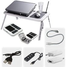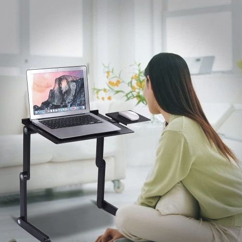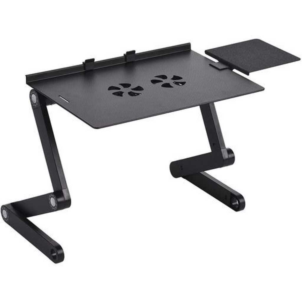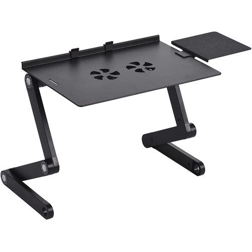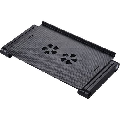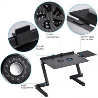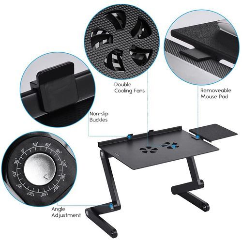 Foldable Laptop Table Stand Vented Computer Desk Bed Lap Tray 360 Degree Adjustable with Mouse Pad Cooling Fans Features: Sturdy auto-locking joints – 360° adjustable, easily lock in any height and angle you need. Easily folded and portable. Multiple uses – laptop holder, bed lap tray, standing desk, book tray and writing desk. Built-in double fans – silently cool your laptop on USB power. Ultra lightweight – Made of aluminum alloy, light and strong. Specification: Material: Aluminum Alloy Color: Black Item Size: 42 * 27 * 47cm/ 16.5 * 10.6 * 18.5in Item Weight: 1640g/ 3.6lb. Package Size: 49 * 28 * 6cm/ 19.3 * 11 * 2.4in Package Weight: 1693g/ 3.7lb. Key Features: Multiple uses Ultra lightweight Built-in double fans 360° adjustable, easily lock in any height and angle you need Easily folded and portable.