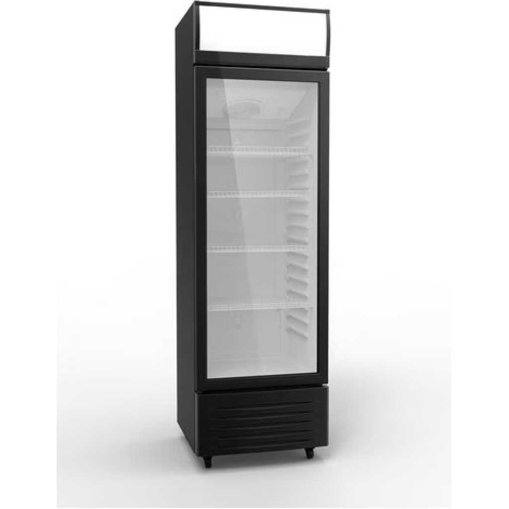 Venus 380-Litre Single Display Cooler VUSC380; Vertical Display Chiller, Single Door Showcase Refrigerator – Black. 380 Liters Gross Capacity Mechanical Temperature Control Compressor Cooling Fan for Even Cooling Distribution Double glass display door Lockable door Adjustable shelves Hidden End Cap Design Semi- Auto Defrosting