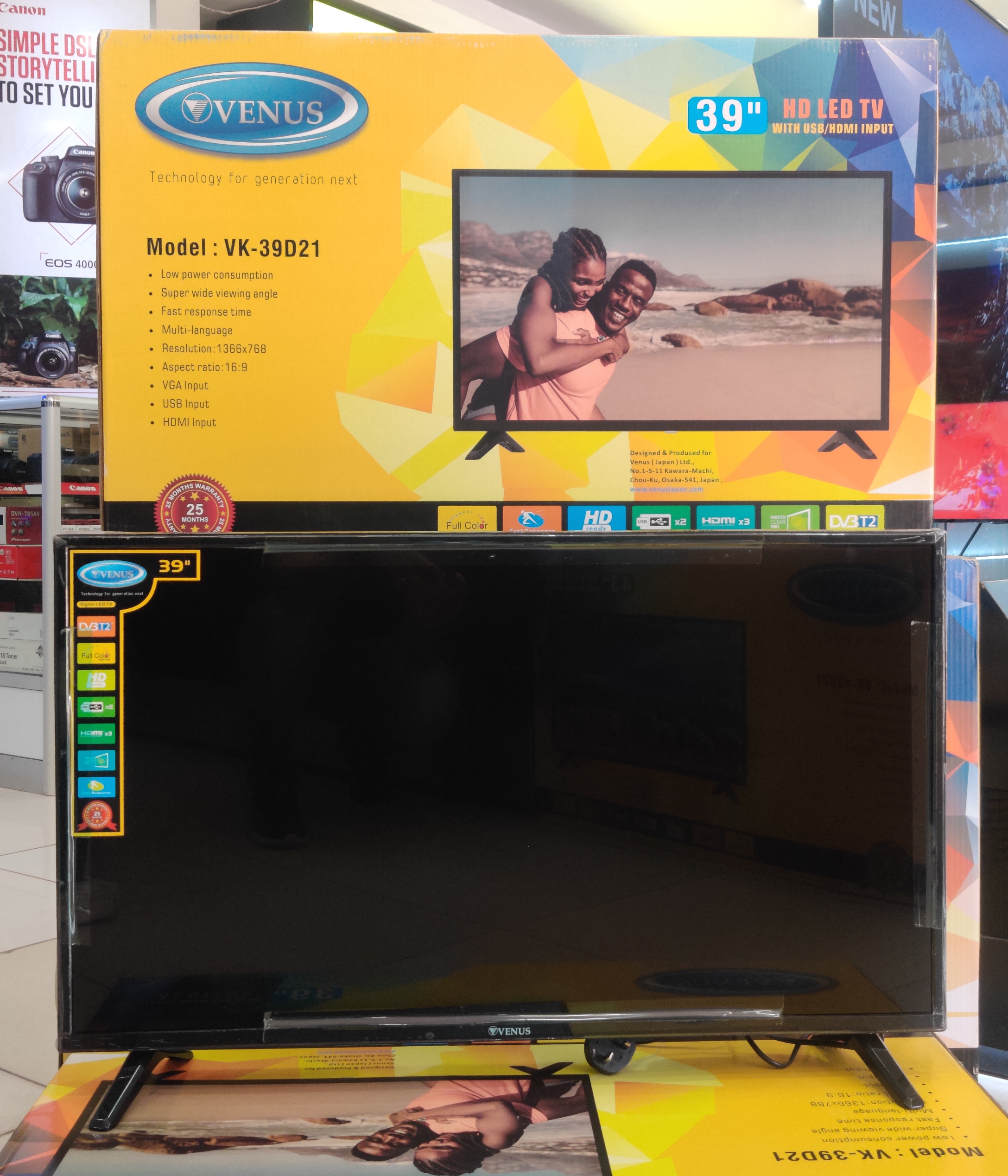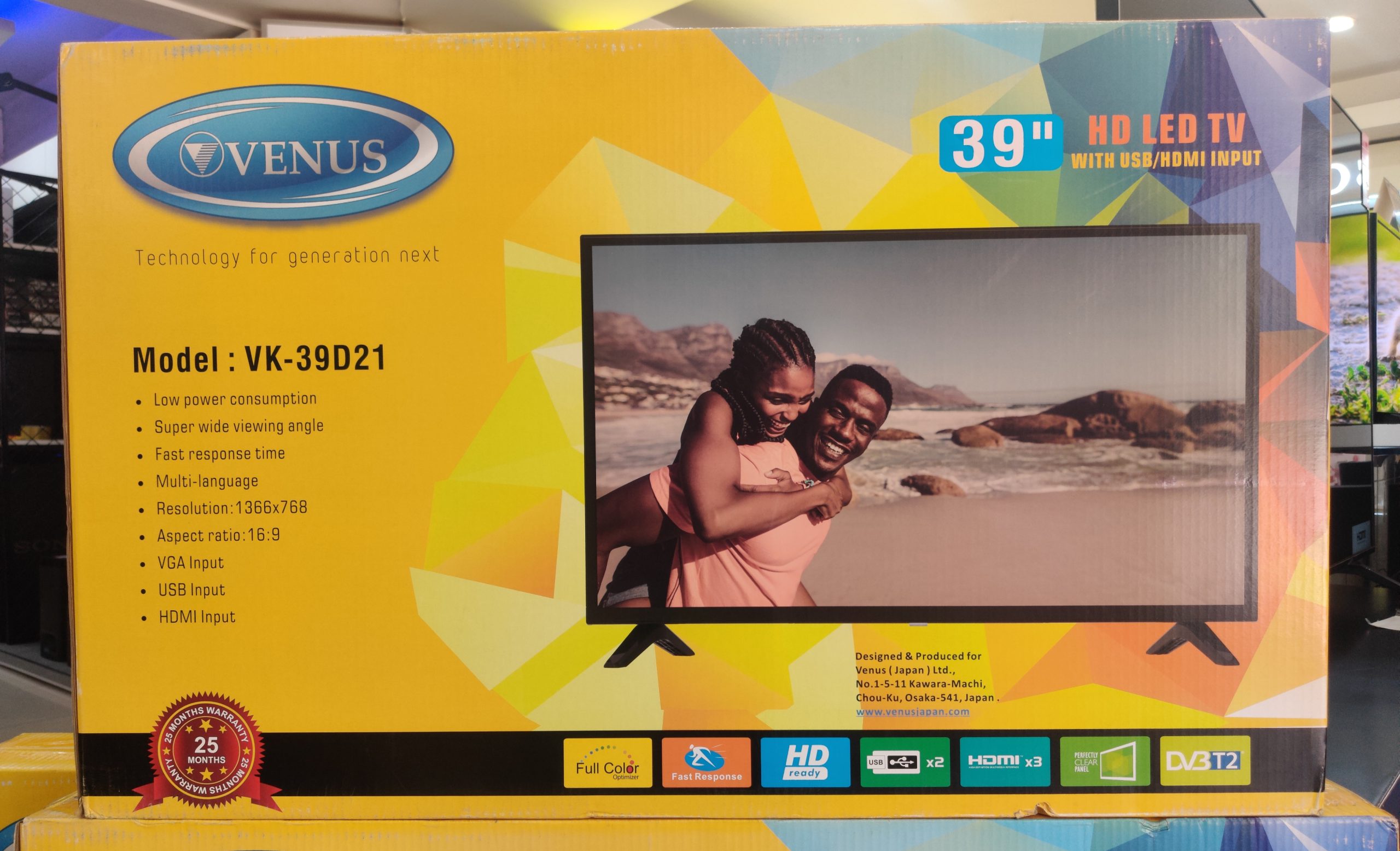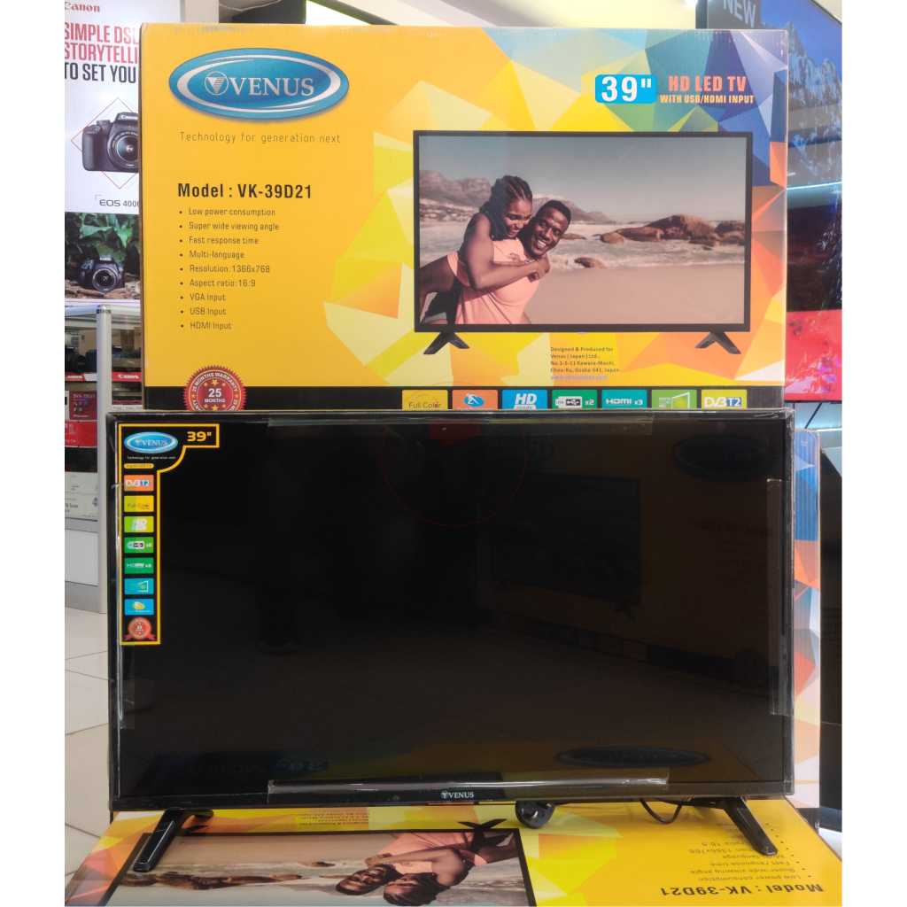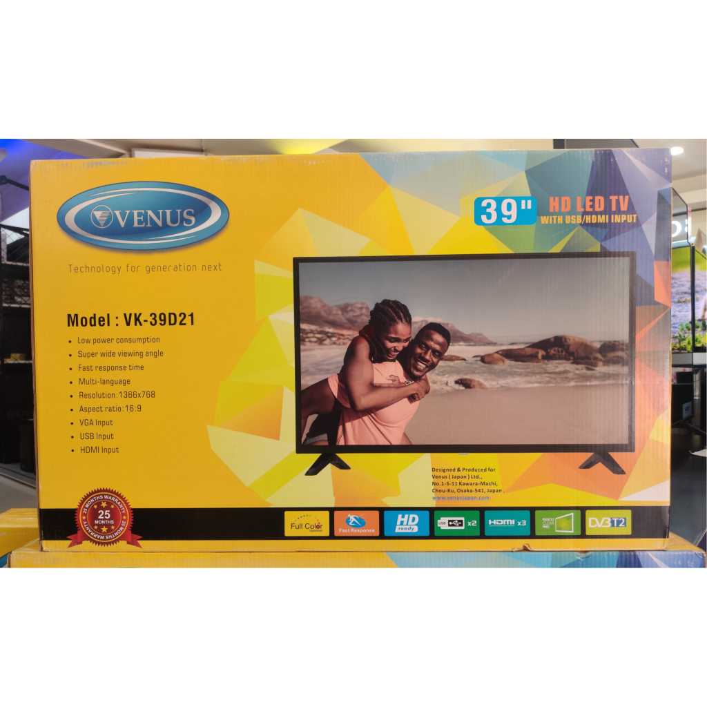 Key Features: Venus 39-Inch Digital TV VK39D21; HD-ready USB, HDMI, Inbuilt Free To Air Decoder – Made in Japan. 39-inch LED TV Digital Tuner to Access Free-to-Air Local Channels FULL HD 1920 x 1080, 16:9 Aspect Ratio HDMI *3 USB *2 VGA (PC Input) RF Input RCA inputs Super wide viewing Angle Fast Response Time 1 Year Warranty Made in Japan