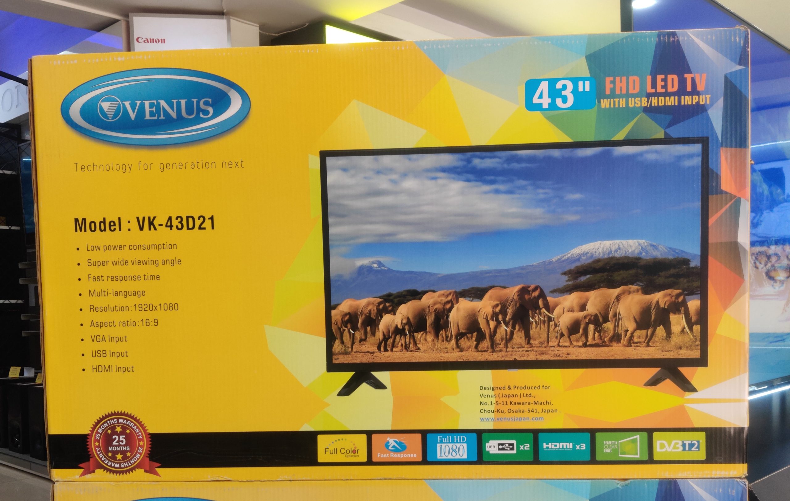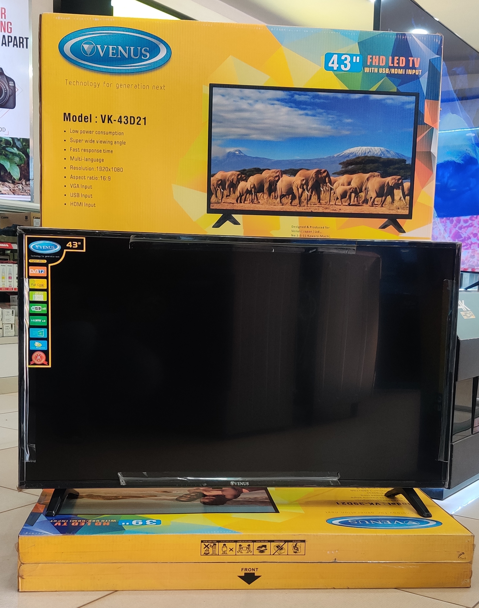 Key Features: Venus Japan 43-Inch Digital TV VK-43D21; Full High Definition; 3-HDMI, 2-USB, VGA, Digital Tuner DVB-T2, Inbuilt Free To Air Decoder – Made in Japan. 43-inch LED TV Digital Tuner to Access Free-to-Air Local Channels FULL HD 1920 x 1080, 16:9 Aspect Ratio HDMI *3 USB *2 VGA (PC Input) RF input RCA inputs Super wide viewing Angle Fast Response Time Multi-Language Low power consumption Full-color optimizer Perfectly clear panel 1 Year warranty. Made in Japan
