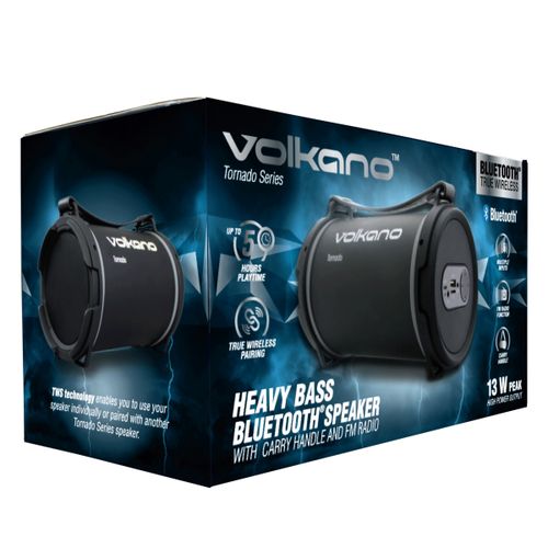 The Volkano Tornado Series Heavy Bass Bluetooth Speaker is a must have accessory for music lovers. It offers fully portable audio via Bluetooth connection, FM Radio, a Micro SD card or a 3.5mm Aux audio jack input. It features heavy bass sound and a range of up to 10 meters.