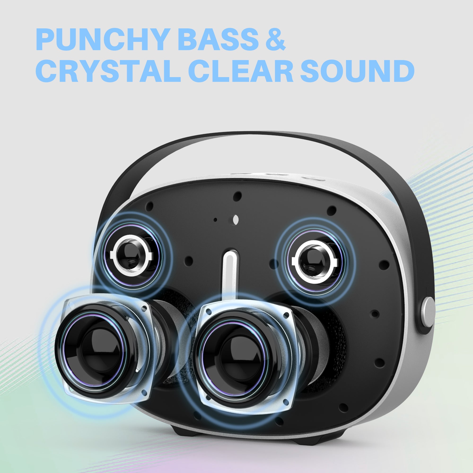 Key Features: PUNCHY BASS & 30W CRYSTAL CLEAR SOUND. Equipped with two tweeters and two woofers, integrated DSP chips, this speaker’s precise acoustic design ensures an extraordinary listening experience. ULTRA PORTABLE IN CHIC DESIGN. A perfect blend of style and sound, a sleek and stylish addition to your audio setup, designed to deliver an immersive music experience wherever you go. EXPERIENCE WIRELESS LIFE. With its built-in microphone, this speaker enables a hands-free phone call experience, allowing you to freely communicate with others while engaged in other activities. VERSATILE AND USER-FRIENDLY. Stream music easily from a USB device or connect via Bluetooth and AUX IN, which are compatible with mobiles, laptops, PCs, and any other music source devices.