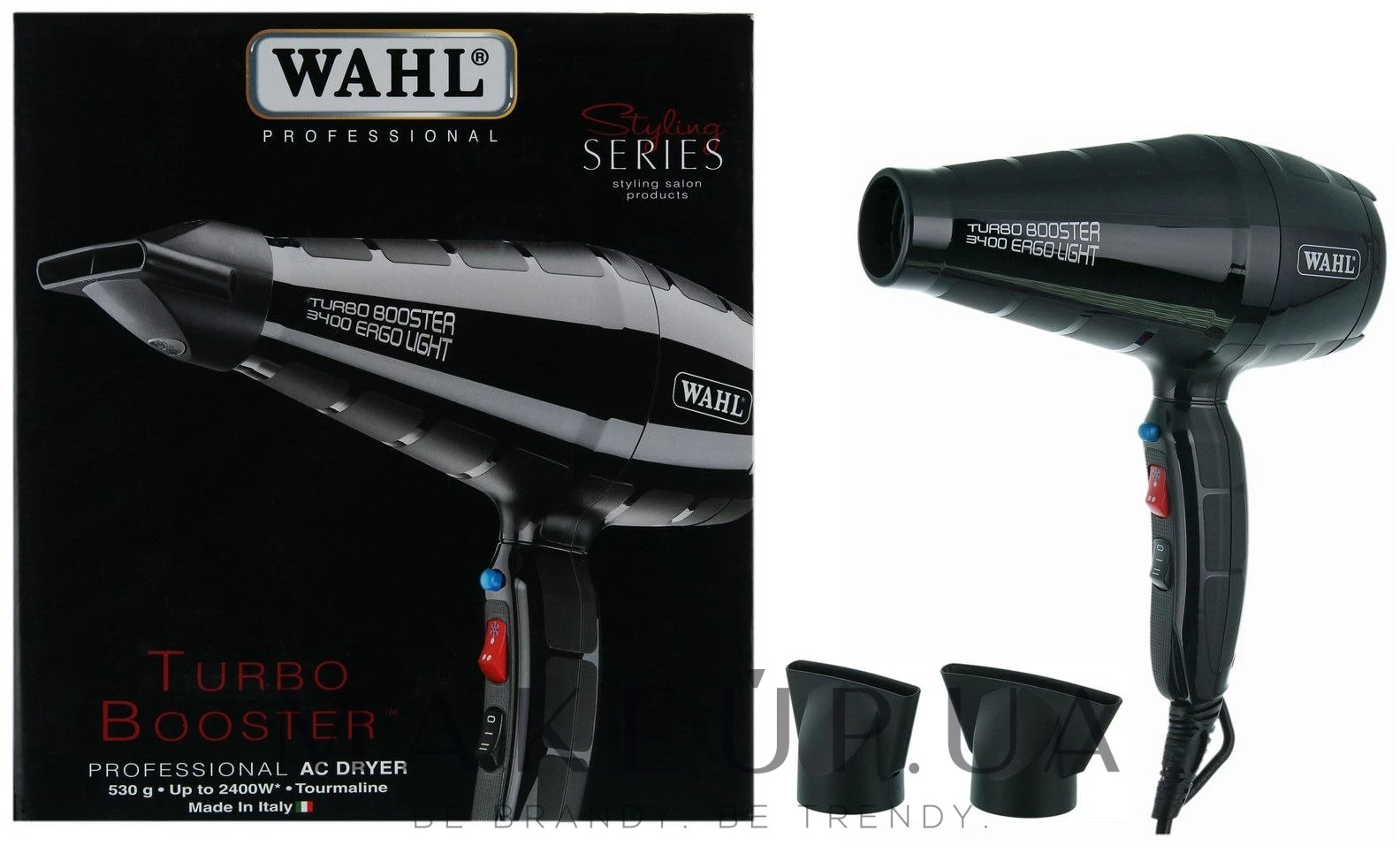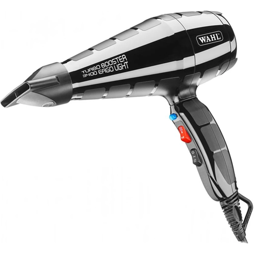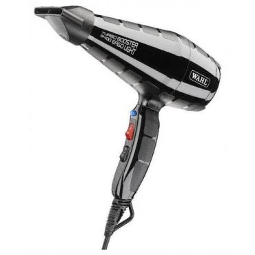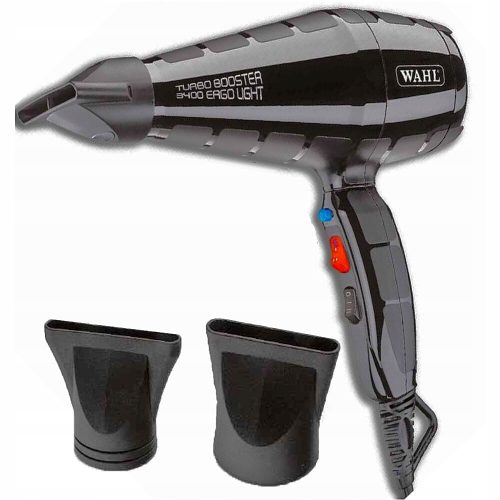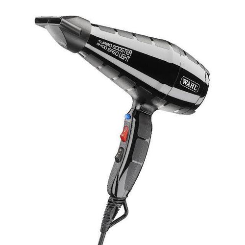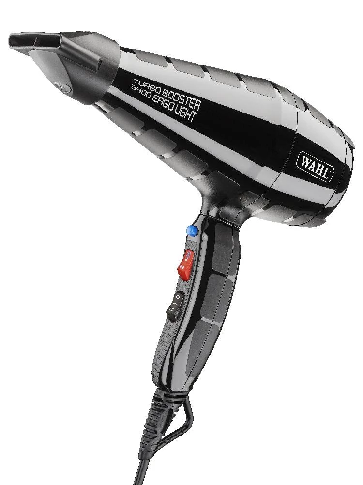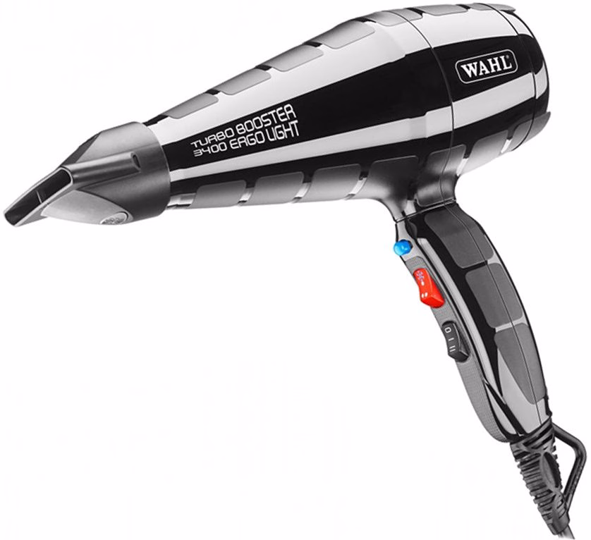 Wahl Turbo Booster 3400 Ergo Light Blowdryer The Turbo Booster 3400 Ergo Light is an extremely powerful hair dryer with 2400 Watt and long-life AC motor. The ultra strong fan ensures maximum airflow. This hair dryer is deisgned with Ceramic technology and shortens the drying time for anti-static shiny hair. The built-in innovative Nano-silver technology has an anti-bacterial effect. In addition, the Turbo Booster is extra compact, lightweight and quiet. Style the hair as desired thanks to the 2x speed settings, 3x temperature settinges and cool shot button. Extremely powerful professional hairdryer Long Life AC motor 2400 Watt 530 grams 22 m/sec air flow Tourmaline technology Nano-Silver technology Short drying time Shiny anti-static hair 2x Speed settings 3x Temperature settings Coolshot button Incl. 2 nozles 3 meters long cord with hanging loop The Turbo Booster 3400 Ergo Light is an extremely powerful hair dryer with 2400 Watt and long-life AC motor. The ultra strong fan ensures maximum airflow.