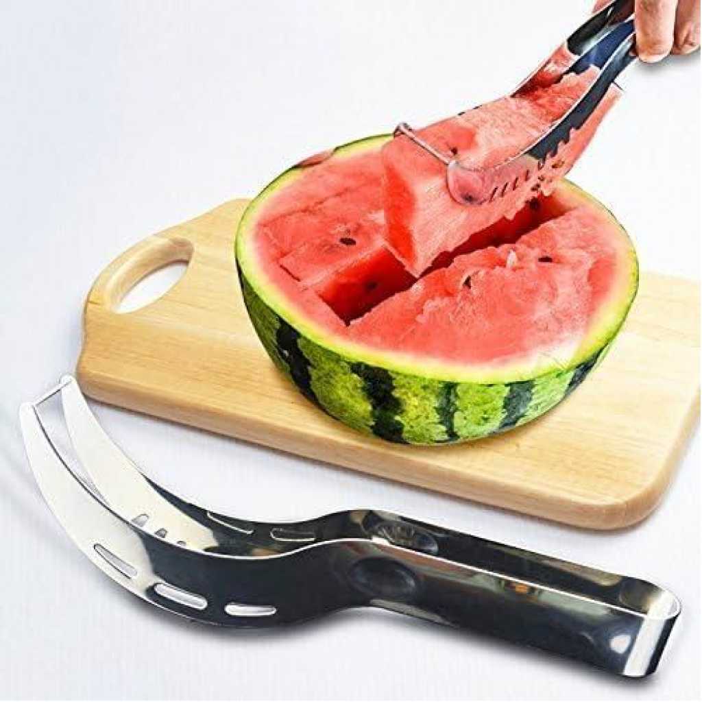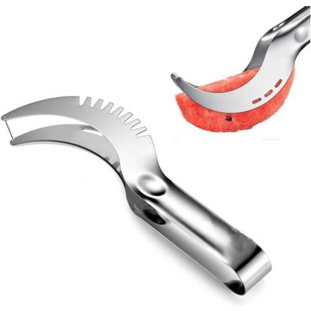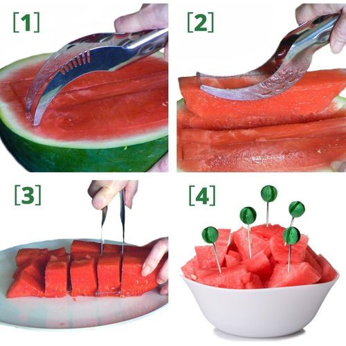 Key Features: Watermelon Slicer, Watermelon Knife & Fruit Slicer Fastest Cutter Multi-purpose Stainless Steel, Smart Kitchen Gadget Efficient Cutting This watermelon cutter is specially designed for cutting watermelons. First, cut the watermelon vertically and then cross-cut the watermelon. We will quickly cut the watermelon slices into squares, making you and your family and friends enjoy the sweet watermelon pieces. Safe Durable Made from 304 stainless steel, certified, rust-proof, drop-resistant, wear-resistant, durable, and safe to use. The unique rounded edge and non-sharp blade design protect your hands well. Easy to Use The watermelon slicer is easy to use without additional tools and does not dirt your hands. You can quickly and easily cut into watermelon fruits with a simple step. The unique design allows you to cut the perfect cube-shaped watermelon slice every time. Lightweight Portable The lightweight and compact design makes it easy to use, carry, and store, which is very suitable for home or outdoor camping. The watermelon cutter is easy to clean, just rinse with water to keep it clean after use. You can easily cut the watermelon into pieces and eat it with a fork. Simplify the cutting process, only 10 seconds can be evenly cut into watermelon pieces.
