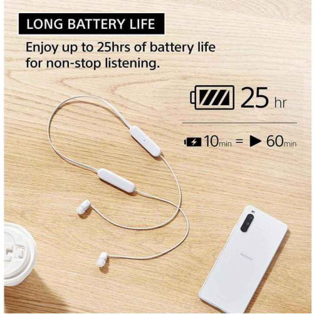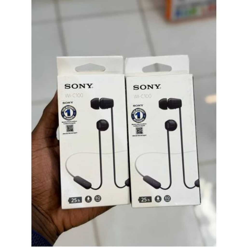 From the manufacturer WI-C100 Made for the day ahead Wireless In-ear Headphones Long Battery Life Enjoy up to 25hrs of battery life for non-stop listening. And if your headphones are running low on power, a 10-minute quick charge will give you up to 60 minutes of playback. Splash-proof and sweat-proof with an IPX4 rating With an IPX4 water resistance rating, splashes and sweat won’t stop these headphones – so you can keep on moving to the music. DSEE – Give your favorite music a boost When an original musical file is compressed our Digital Sound Enhancement Engine faithfully restores music to high-quality sound that’s closer to the original recording. Flexible neckband Lightweight and portable, the WI-C100 headphones have a flexible neckband that makes them even easier to slip into your bag when you’re on the move. Easy to use buttons The WI-C100 headphones are easy to operate, with buttons to play and pause, skip tracks, adjust the volume, and receive calls. For convenience, the buttons have been redesigned, with a more pronounced shape making them easier to press. Clear hands-free calling Conversations flow freely with clear hands-free calls thanks to our high-quality built-in microphone. Your sound, how you like it Fine-tune your sound using the Sony | Headphones Connect app. Fast Pair Quickly and effortlessly pair your headphones with your Android device with just a simple tap. Experience 360 Reality Audio Sound as real as if you are there at a live concert or with the artist in the recording studio. Note : If the size of the earbud tips does not match the size of your ear canals or the headset is not worn properly in your ears, you may not obtain the correct sound qualities or call performance. Change the earbud tips to ones that fit more snugly in your ear Long battery life of up to 25 hours DSEE restores high frequency sounds lost in compression Splash-proof and sweat-proof with an IPX4 rating Easier, clearer hands-free calling Fine-tune your sound using the Sony | Headphones Connect app Easy to operation with buttons to play and pause, skip tracks and adjust the volume A well-balanced shape around the neck ensures a stable fit The WI-C100 headphones have a flexible neckband that fits to you Sync your headphones easily with Fast Pair.