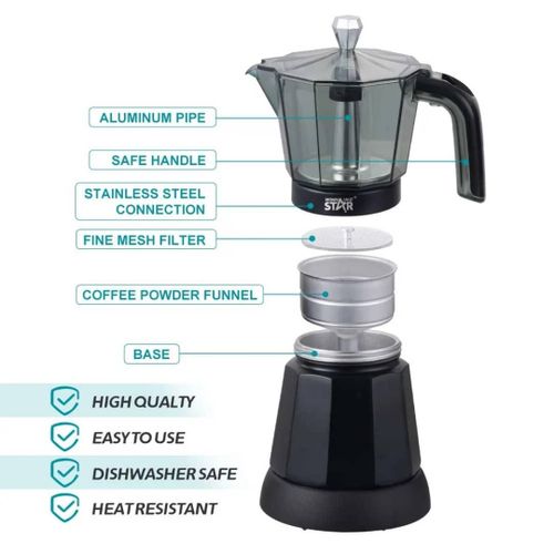 Warm and delicious coffee can dispel our fatigue and feel the happiness of life. Made of ABS, acrylic, silicone and aluminum alloy and using a painting process, our espresso machine can be used for a long time. Made of ABS, acrylic, silicone and aluminum alloy and equipped with a painting process, our espresso machine can be used for a long time. 480 W power and a high-quality heating element make it possible to start a wonderful journey in a short time. The power of 480 W and the high-quality heating element make it possible to start a wonderful journey in a short time, which allows you to better explore the beauty of life. Details: Round corners: Compared to traditional angular corners, an arc-shaped design can better prevent your skin from being scratched. Long power cord: The 3.94 foot long cable provides enough disposable length for easy placement and can better protect your safety. Anti-drip nozzle: This nozzle provides a softer and more even liquid flow, prevents splashes and drops, giving you a better experience. Stable base: The detachable base (5.7 x 6.7 inches) with 360° rotation is not only convenient for you to use, but also increases the stability of the product. Product Silicone sealing ring: It can effectively prevent leakage, keep the table clean and save your cost. Usage: This product is suitable for 1-6 people and can be widely used in families, meetings, cafes, offices, student houses, milk tea shops, travel, business trips etc. This product is suitable for 1-6 people and can be used in families, gatherings, cafes, offices, student houses, milk tea shops, traveling, business trips, etc. for making various beautiful coffees yourself. This WINNING STAR ST-6802 Electric Moka Pot is made from high-quality Nylon, die-cast aluminum, and PC material, ensuring durability and safety. It features a 480W power output with AC 220V-240V voltage support, automatic rebound power-off, anti-dry burning function, and a working power indicator for added convenience How to use: 1. Turn the top jug to open. 2nd 2. Remove the powder dispenser and lid. 3. Put a suitable amount of water in the bottom pot (hot water can also be used). 4) Place the powder dispenser in the lower container. 5. Screw the top pot. 6. Place the product in the heating base, press the button and the red indicator light lights up to indicate that it is working. Technical data: Colour: silver. Material: ABS, acrylic, aluminum alloy, silicone. Surface treatment: muffle lacquer. Plug standard: EU standard Assembly required: yes. Mounting: Freestanding. Rated voltage: 220 V. Nominal frequency: 50 Hz. Consumption: 480W Maximum pressure: 2.5 bar. Number of articles: 1 Total capacity: about 300ml/12.68oz Suitable people: 1-6 Dishwasher safe: no. Base rotation: 360 degrees. Net weight: 1.14 kg. Gross weight: 1.2 kg. Product Dimension(D*H): 10.2 * 19.5cm/4 * 7.68 inch Dimensions of the base: 17 x 14.5 cm. Package dimensions: 18 x 15 x 27 cm. Power cord length: 1.2 m. Box contents: 1 x espresso machine. 1 x base. 1 x English user manual. Notes: 1. Please follow the instructions for use and follow the safety instructions in the instructions (English language not guaranteed). 2. Please note that the package contains only one espresso machine and no coffee. 3) Do not put the appliance in the dishwasher, but let it dry in time after cleaning. 4. New products need a shrinkage time, and after shrinking, putting on will be very smooth. If the portion size decreases during shrinkage, the device will no longer work properly.