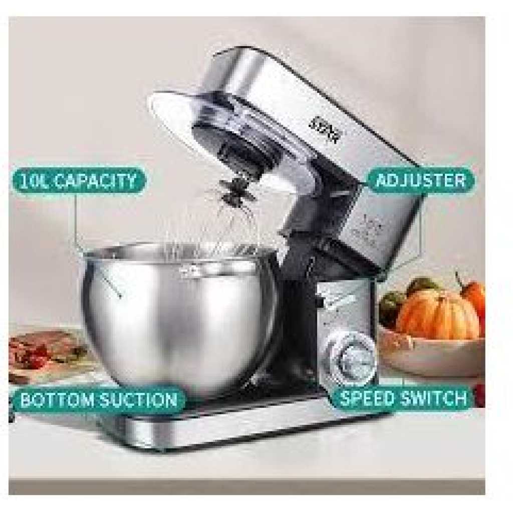Winning star 6-Speed Stand Mixer Cook Machine 10L with Stainless Steel Bowl Copper Motor Aluminum Dough Hook Flat Agitator Spatula 304 Balloon Whisk LED Indicator Light 4 Sucker Feet BS Plug- Silver The 6-Speed Stand Mixer with pulse function, is a great addition to your kitchen to simplify your everyday tasks. Create fluffy meringue or whip cream for delicious desserts with ease when you use the whisk beater in your Saachi stand mixer. Take the effort out of kneading dough! Simply use the dough hook and let your mixer take care of preparing dough for a home baked loaf. Features – 6 speed control with pulse function – One touch control – 10 Liters stainless steel mixing bowl – Stainless steel Attachments: Whisk, Mixing blade & Dough Hook – Pure copper motor – Planetary mixing action – Tilt-head design electric mixer – Stainless steel whisk for light mixture – Cream, Egg – Stainless steel beater for medium mixtures – Salad, Cookies – Stainless steel dough hook for heavy mixtures – Bread, Pizza