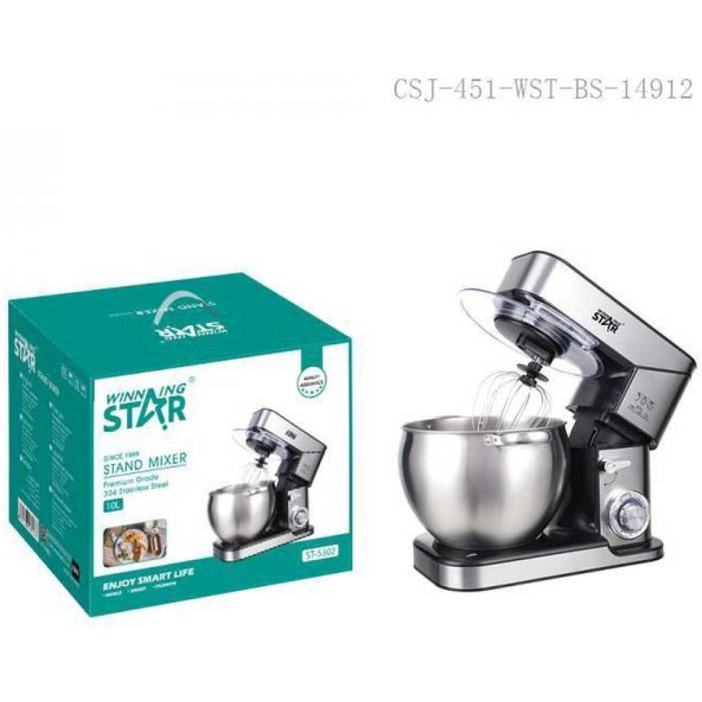 Key Features: Winning star 6-Speed Stand Mixer Cook Machine 10L with Stainless Steel Bowl Copper Motor Aluminum Dough Hook Flat Agitator Spatula 304 Balloon Whisk LED Indicator Light 4 Sucker Feet BS Plug- Silver 6 speed control with pulse function – One touch control – 10 Liters stainless steel mixing bowl – Stainless steel Attachments: Whisk, Mixing blade & Dough Hook – Pure copper motor – Planetary mixing action – Tilt-head design electric mixer – Stainless steel whisk for light mixture – Cream, Egg – Stainless steel beater for medium mixtures – Salad, Cookies – Stainless steel dough hook for heavy mixtures – Bread, Pizza