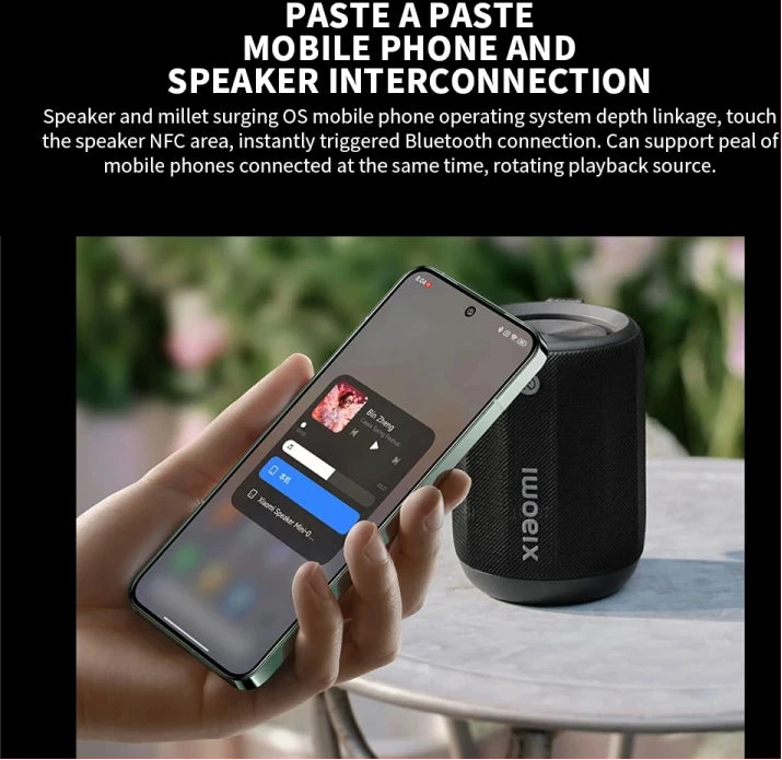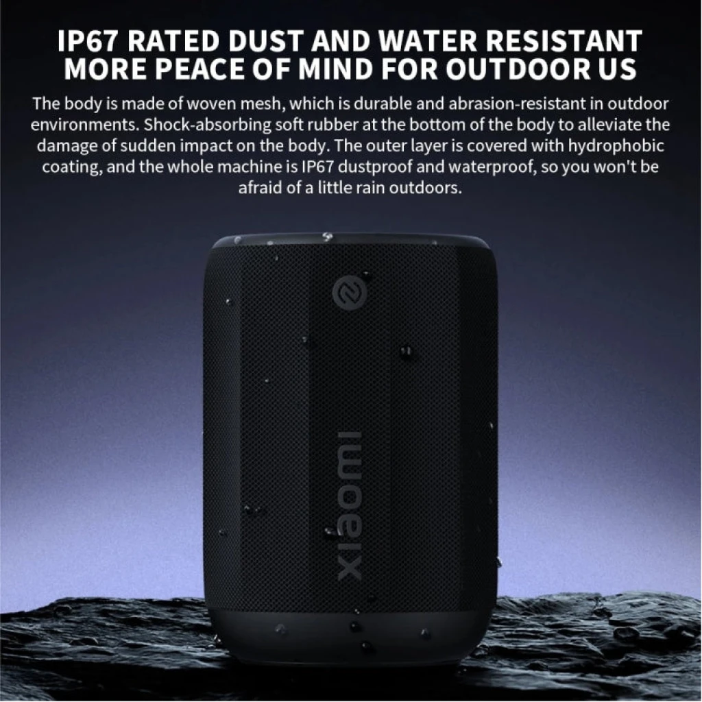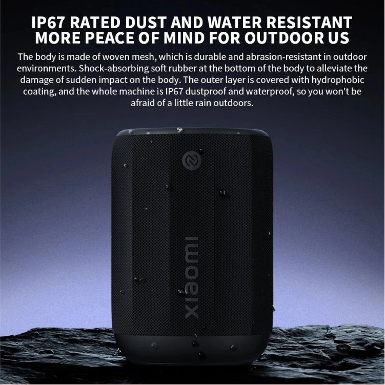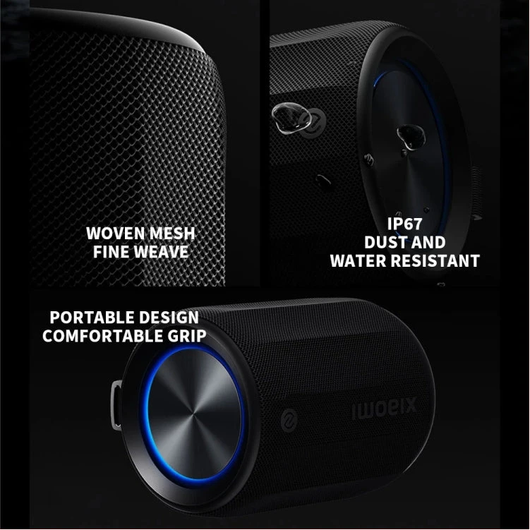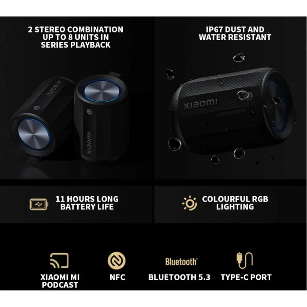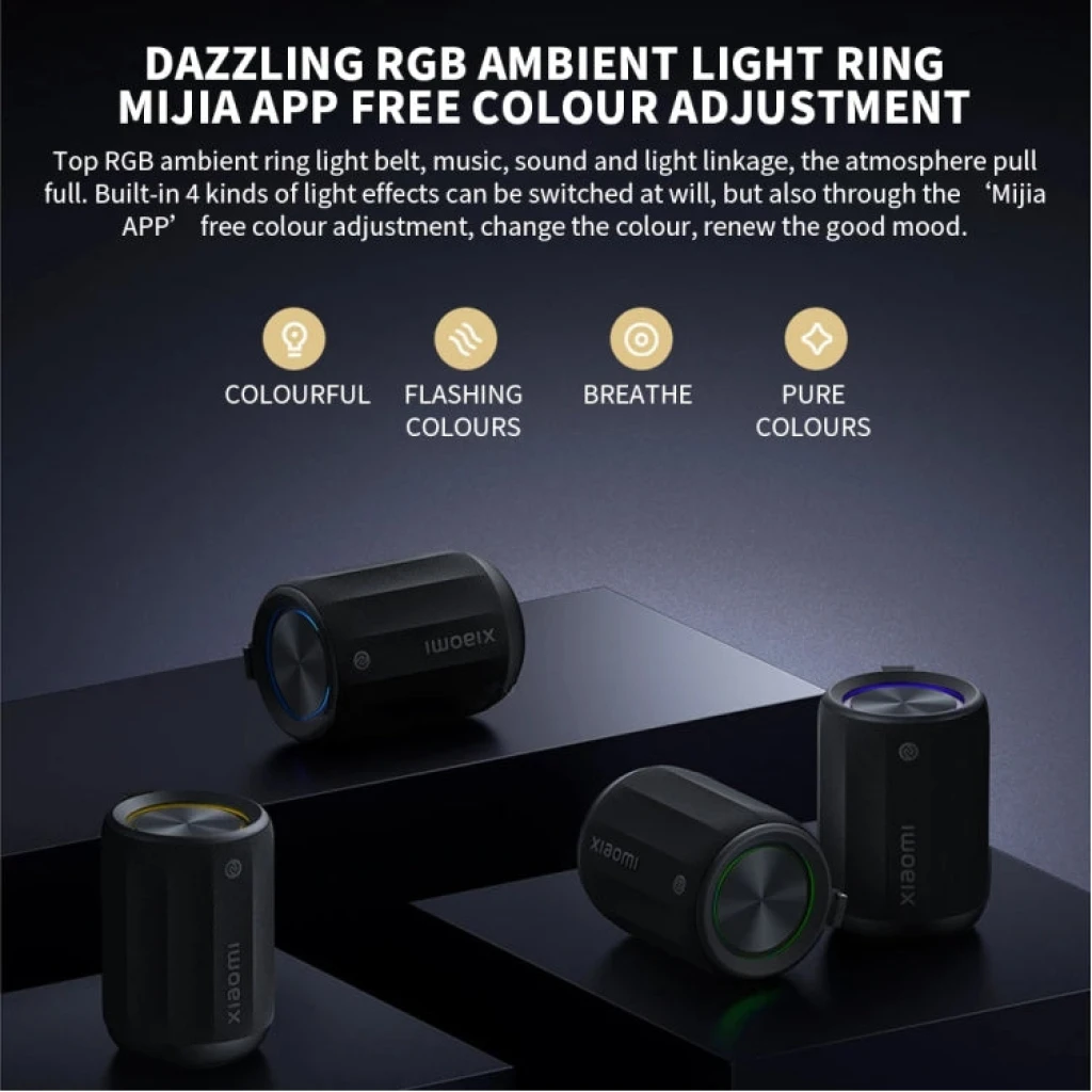 Key Features: Xiaomi Bluetooth Speaker Mini Support NFC Connection(Black). 1. Equipped with Bluetooth 5.3 technology, fast connection and stable transmission. 2. The top RGB atmosphere ring light strip, music sounds, sound and light are linked, full of atmosphere. 3. IP67 dustproof and waterproof design, the body is made of woven mesh, wear-resistant and durable, and the bottom of the body is shock-absorbing soft rubber to alleviate the damage to the body caused by sudden impact. 4. Built-in 2000mAh battery, full power supports 11 hours of music playback, long-lasting battery life.