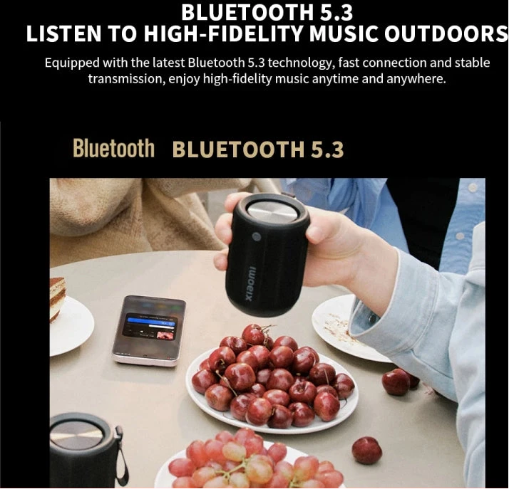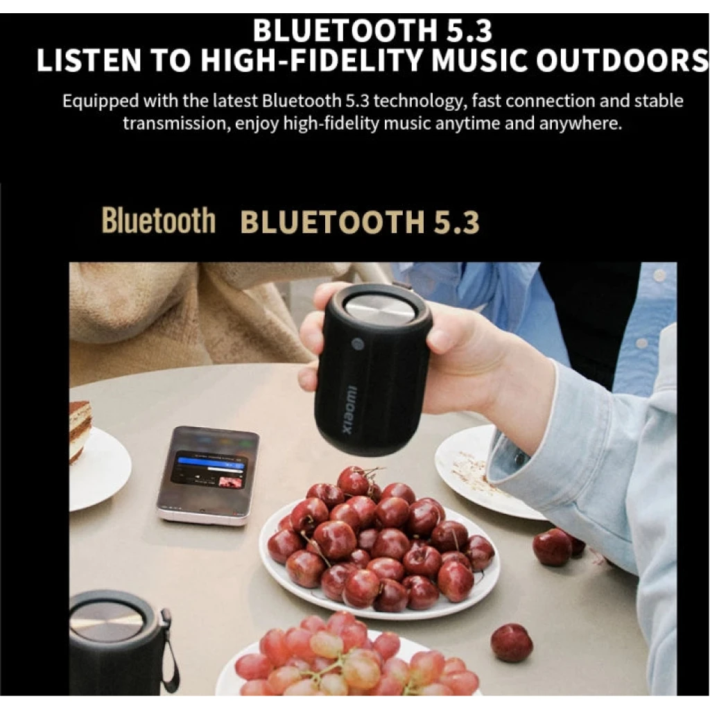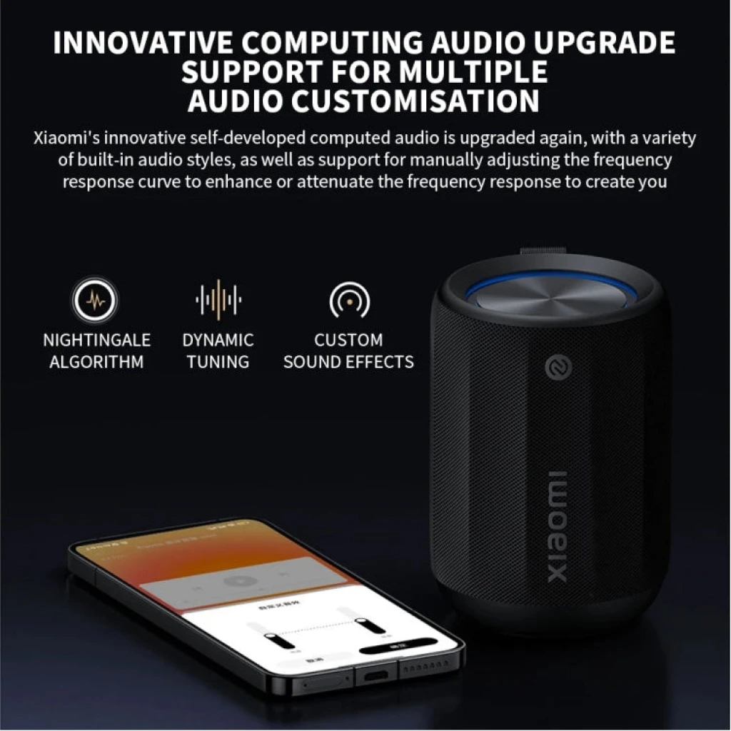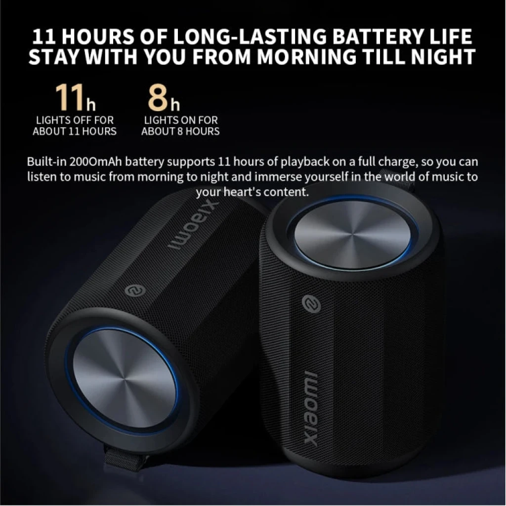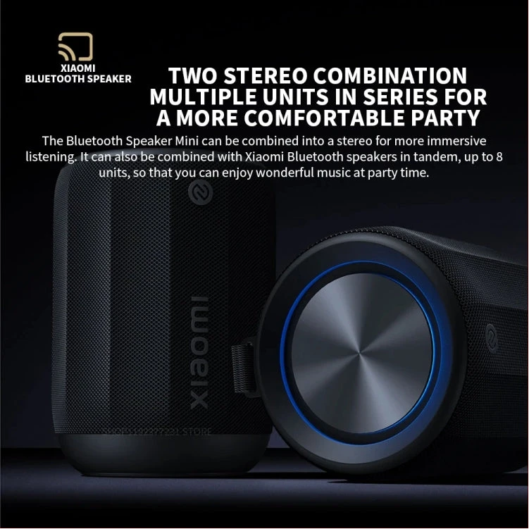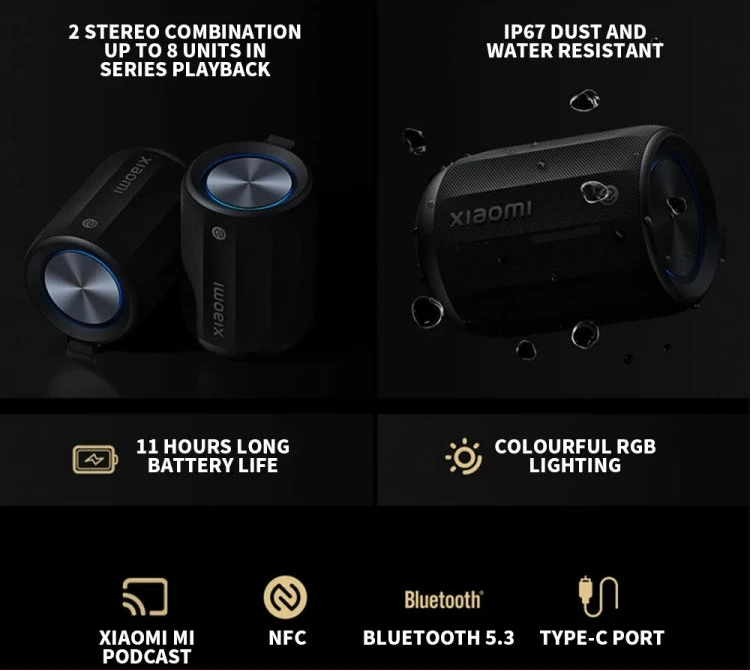 Key Features: Xiaomi Bluetooth Speaker Mini Support NFC Connection(Black). 1. Equipped with Bluetooth 5.3 technology, fast connection and stable transmission. 2. The top RGB atmosphere ring light strip, music sounds, sound and light are linked, full of atmosphere. 3. IP67 dustproof and waterproof design, the body is made of woven mesh, wear-resistant and durable, and the bottom of the body is shock-absorbing soft rubber to alleviate the damage to the body caused by sudden impact. 4. Built-in 2000mAh battery, full power supports 11 hours of music playback, long-lasting battery life.