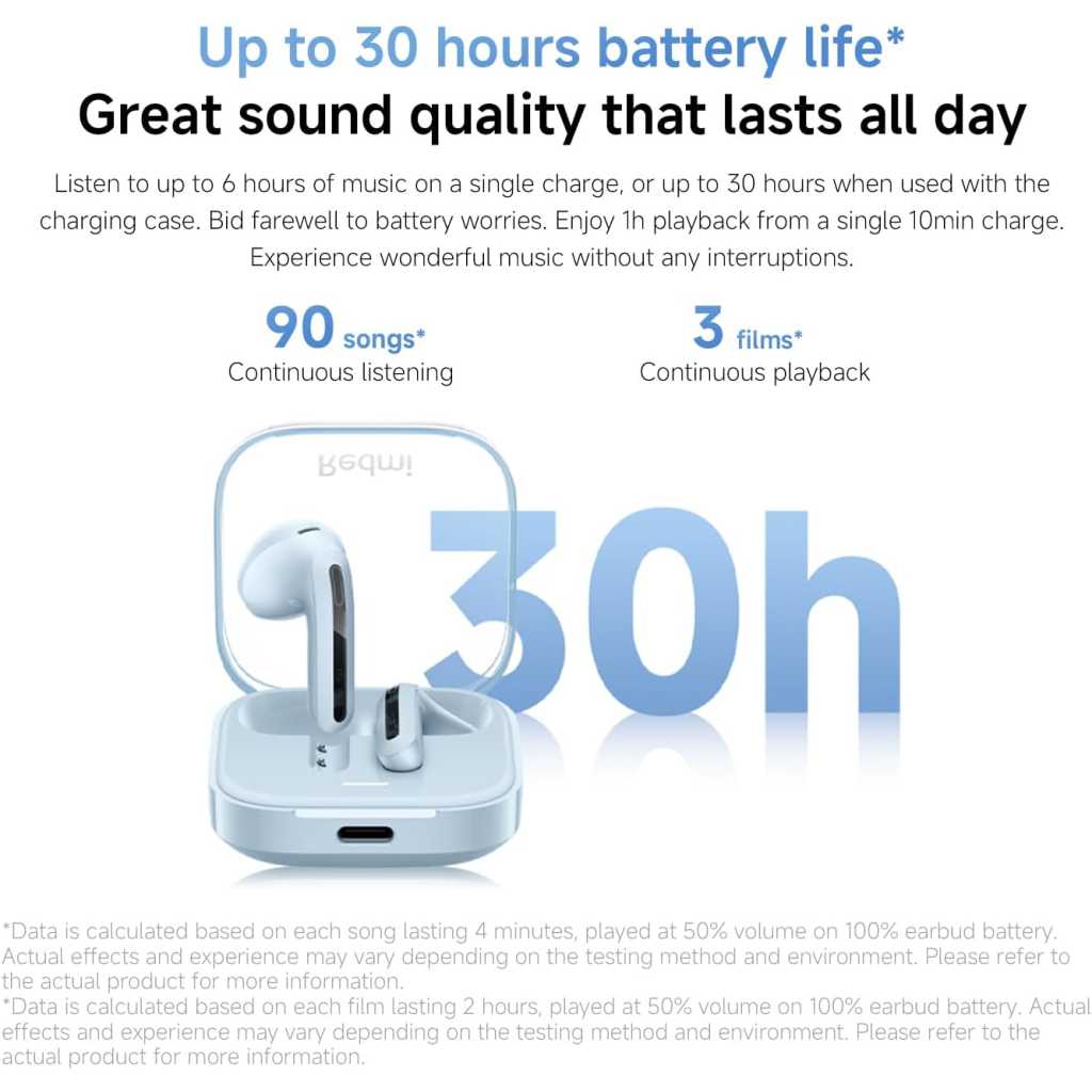Long Playback and Quick Charging: Up to 6 hours of continuous playback on a single charge, and can be used with a charging case for up to 30 hours of music playback. In addition, it has a fast charging feature that allows up to 1 hour of playback time on just 10 minutes of charge, so you don’t have to worry about sudden online meetings Powerful Bass and Clear Sound Quality: Equipped with a 14.2mm dynamic driver and precise tuning with Xiaomi Acoustic Lab, you can enjoy an amazing sound experience with solid bass Clear Call Voice with Dual Mic Noise Reduction:Dual microphone noise reduction reduces wind noise up to 4m/s when phone calls. It also effectively reduces ambient noise so you can make clear calls indoors or outdoors 5 Equalizer Settings via Xiaomi Earbuds:Built-in 5 Equalizer settings to support a variety of scenes. For example, you can experience a powerful, dynamic drum beat in bass enhanced mode, or even enjoy the singer voice clearer in vocal mode 14.2mm dynamic driver, 5 Tuning Modes