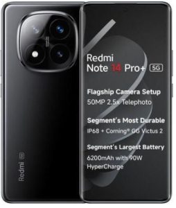 Xiaomi Redmi Note 14 Pro+ 5G Specifications (8GB RAM + 256GB ROM Variant – Black) The Xiaomi Redmi Note 14 Pro+ 5G (Global model) is a premium mid-range smartphone launched in January 2025 , available in colors including Midnight Black . This variant features 8GB RAM and 256GB storage , emphasizing flagship-level camera, fast charging, and durable build. Display Size: 6.67 inches AMOLED (Curved) Resolution: 1220 x 2712 pixels (1.5K, ~446 ppi density) Refresh Rate: 120Hz Brightness: Up to 3000 nits (peak) Protection: Corning Gorilla Glass Victus 2 Other: HDR10+, Dolby Vision, 68B colors, eye-care features Performance Chipset: Qualcomm Snapdragon 7s Gen 3 (4nm process) CPU: Octa-core (1×2.5 GHz Cortex-A720 + 3×2.4 GHz Cortex-A720 + 4×1.8 GHz Cortex-A520) GPU: Adreno 810 RAM: 8GB LPDDR4X Storage: 256GB UFS 2.2 (no microSD slot; higher variants up to 512GB) OS: Android 14 with HyperOS (up to 3 major Android upgrades + security patches) Camera Rear (Triple Setup): Main: 200MP (Samsung HP9 sensor, f/1.65, OIS, multi-directional PDAF, 1/1.4″ size) Ultra-wide: 8MP (f/2.2, 120° FOV) Macro: 2MP (f/2.4) Features: LED flash, HDR, panorama; Video: 4K@24/30fps, 1080p@30/60/120fps, gyro-EIS Front: 20MP (f/2.2); Video: 1080p@30/60fps Battery & Charging Capacity: 5110mAh (typ) Li-Po (non-removable) Charging: 120W HyperCharge wired (100% in ~19 minutes; charger included in some regions) Build & Design Dimensions: ~162.3 x 74.4 x 8.6 mm Weight: ~205–210g (leather/vegan leather variants heavier) Build: Glass front (Gorilla Glass Victus 2), aluminum frame, eco-leather or glass back IP Rating: IP68 dust/water resistant (up to 1.5m for 30 min) Colors: Midnight Black (among others like Lavender Purple, Frost Blue) Other: Dual SIM (Nano-SIM), stereo speakers, IR blaster Connectivity & Sensors Network: 5G SA/NSA (global bands) Wi-Fi: Wi-Fi 6 (802.11ax) Bluetooth: 5.4 NFC: Yes (market-dependent) Positioning: GPS, A-GPS, GLONASS, GALILEO, BDS, QZSS USB: Type-C 2.0 Sensors: Under-display optical fingerprint, accelerometer, gyro, proximity, compass Audio & Multimedia Stereo speakers (Dolby Atmos) No 3.5mm headphone jack Additional Notes Strengths: Flagship-level camera (200MP with OIS), ultra-fast charging, premium curved display, durable build/IP68. Price Range (2025): ~$400–500 (mid-premium). Target: Users seeking near-flagship features at mid-range price.