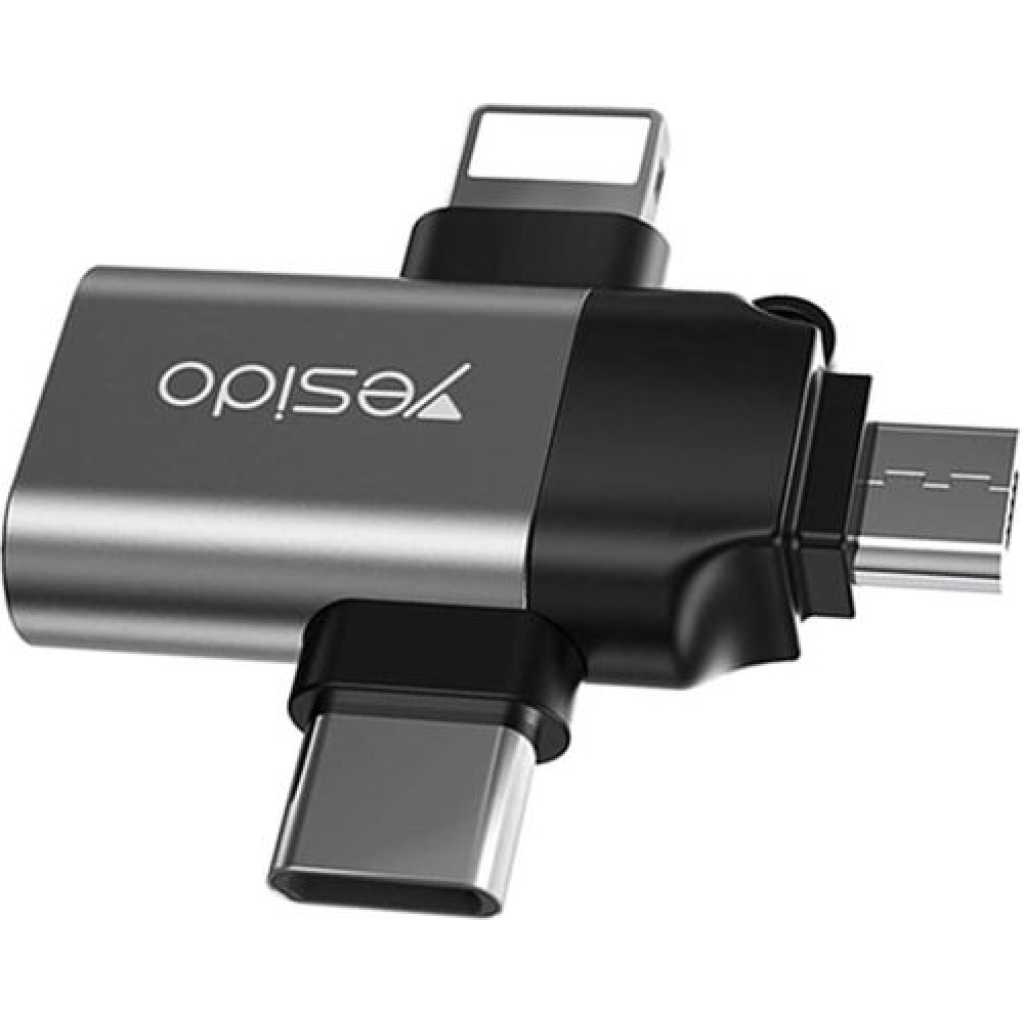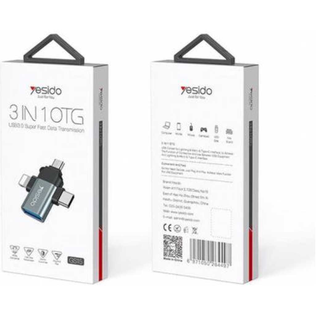 Yesido 3 In 1 OTG USB 3.0 Super Fast Data Transmission Adapter GS15- Multicolor Three-in-One Design: The GS15 adapter is a multifunctional solution that offers three types of connectors in one compact device: USB 3.0 Type-A Female: This standard USB port lets you connect USB flash drives, external hard drives, keyboards, mice, and other USB peripherals to your devices. Type-C Male: This is a Type-C connector designed for modern Android smartphones, tablets, and other devices with Type-C ports. It allows you to connect Type-C accessories and devices. Lightning Male: The Lightning connector is compatible with Apple devices, including iPhones and iPads. It ensures that Apple users can also connect a variety of USB peripherals to their devices. Micro USB Male: The Micro USB connector is compatible with older Android devices and various other electronics that use Micro USB. It ensures compatibility with a wide range of devices. Universal Compatibility: The Yesido-GS15 adapter is designed to work with a wide range of devices. Whether you have a modern Android smartphone with a Type-C port, an Apple device with a Lightning port, or an older device with a Micro USB, this adapter ensures compatibility and seamless connections. Product performance description 1. Compact size and convenient to use, plug and play. 2.3 in 1 Otg Adapter USB 3.0 Female to Type C/ For iPhone /Micro USB Male Adapter 3. Super speed USB 3.0 5Gbps data transmitting rate. 4. Could connect with mouse, USB Flash disk, keyboards, camera, card reader, etc. 5.Work for Tablet & Hard Disk Drive & Flash Disk & USB Mouse etc.