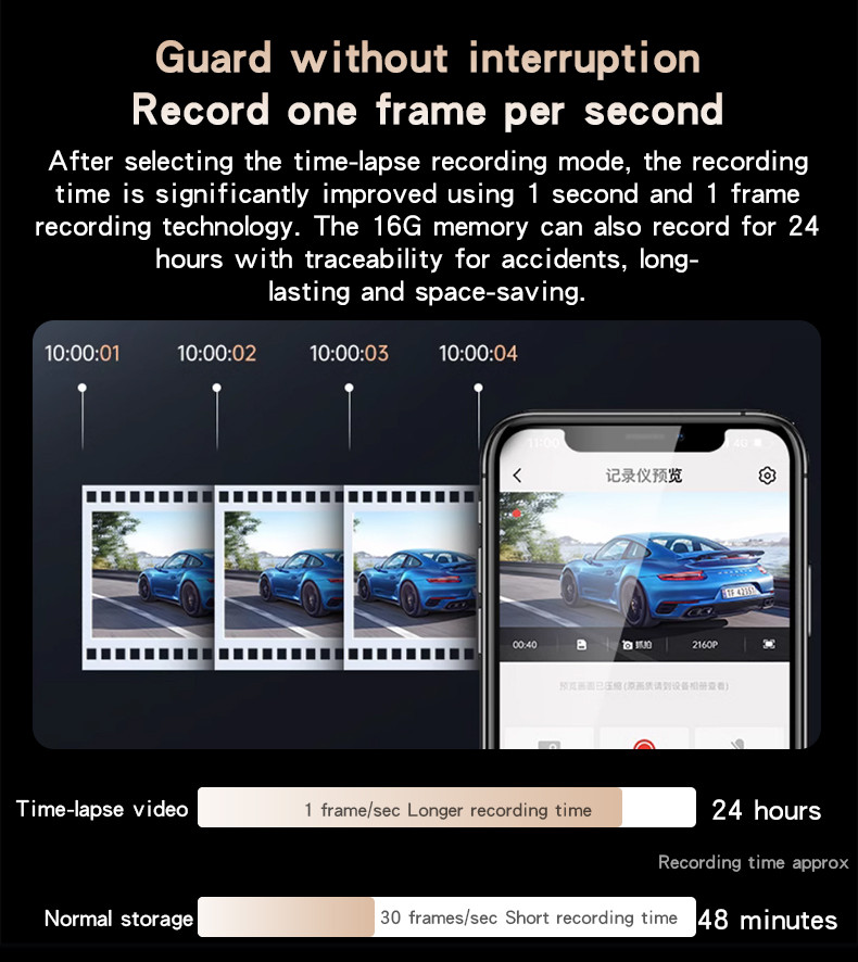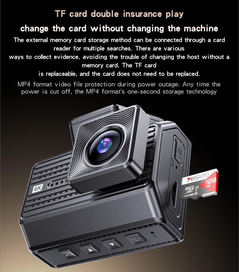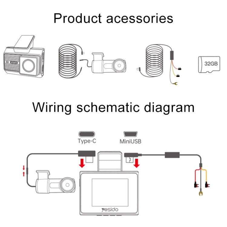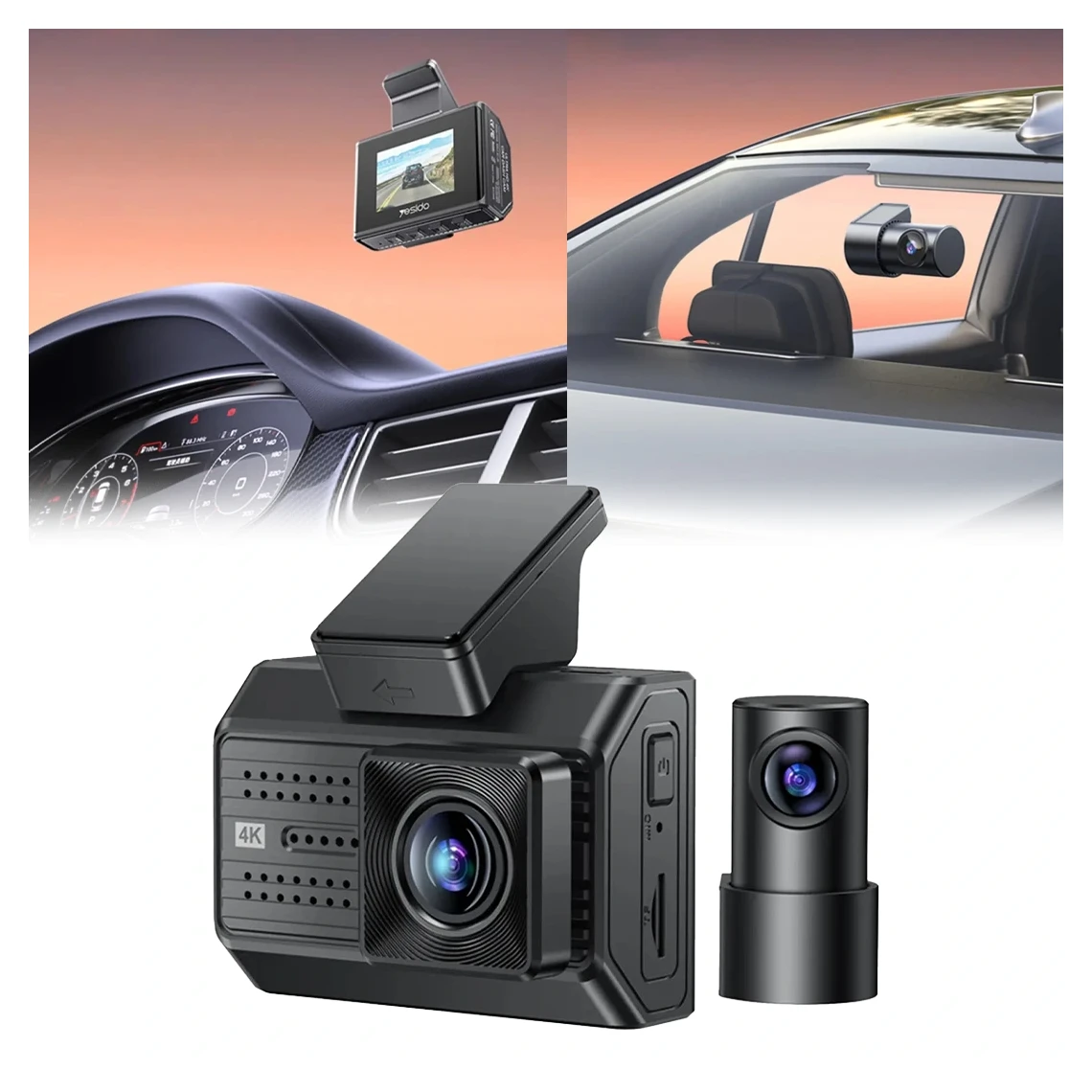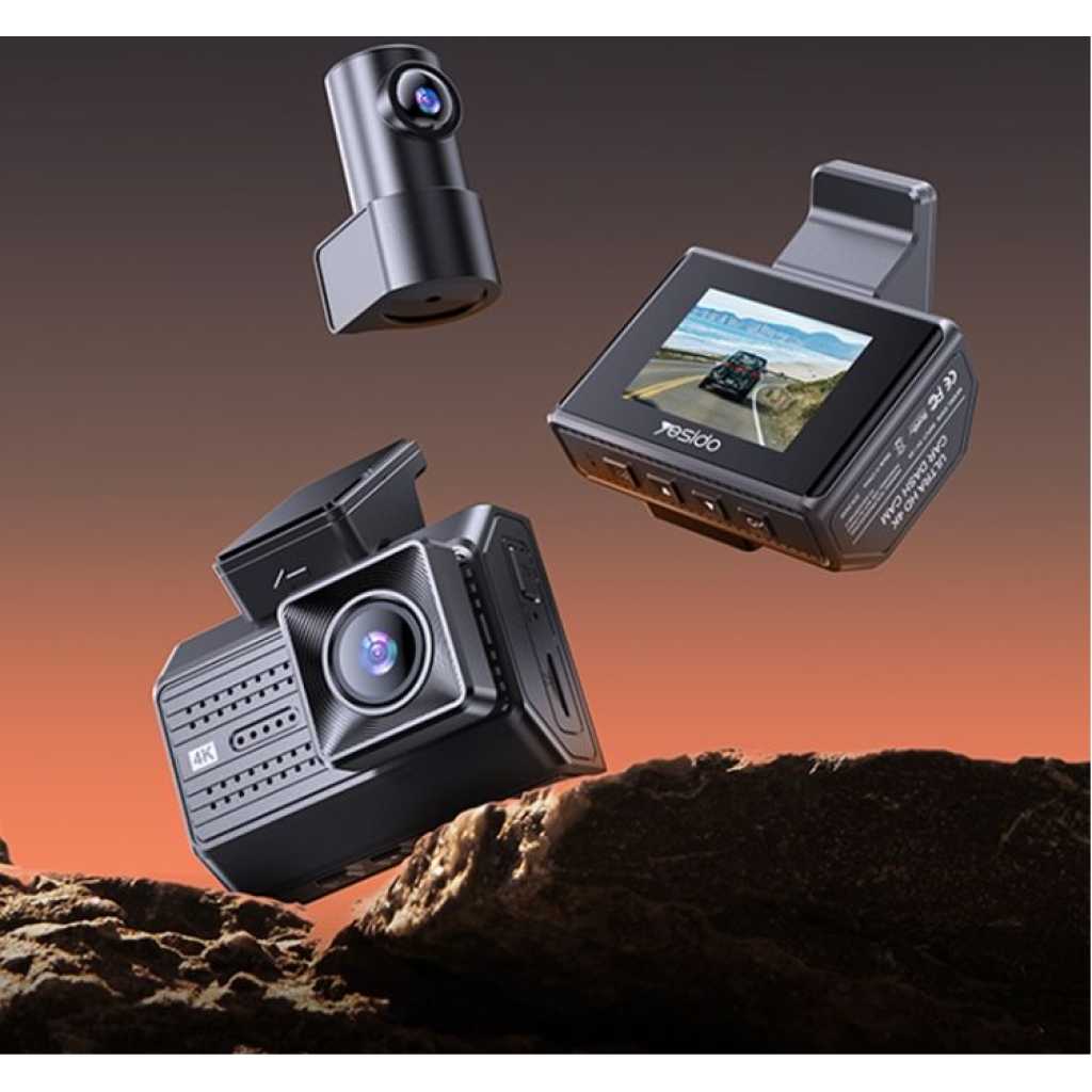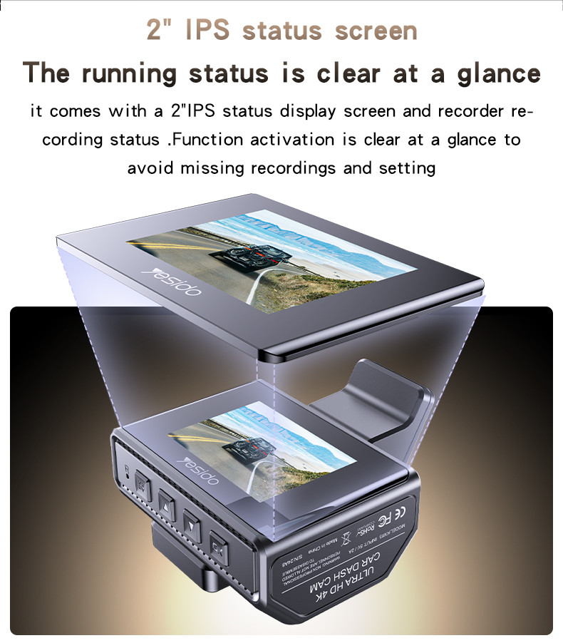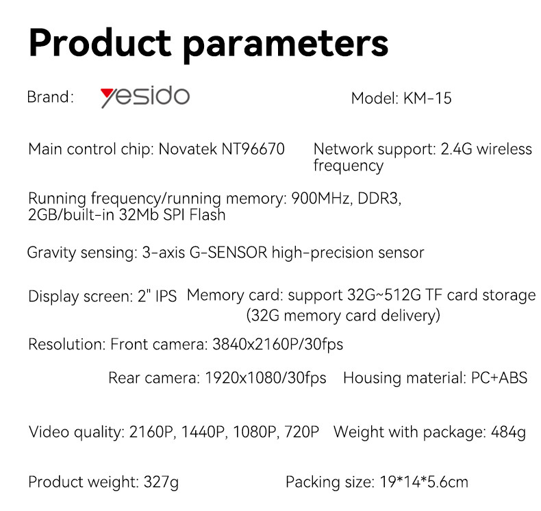 Yesido KM15 4K Driving Recorder Key Features: 1. Material: PC+ABS. 2. Chips: NT96670. 3. Sensor: GC4653 (front) / GC2083(back). 4. RAM: 2G/32Mb. 5. ROM: Max 256G TF card. 6. Pixel: Max 4K/1K. 7. Max 24 hours Circle Record (256G) 8. With a 32Gb TF card.