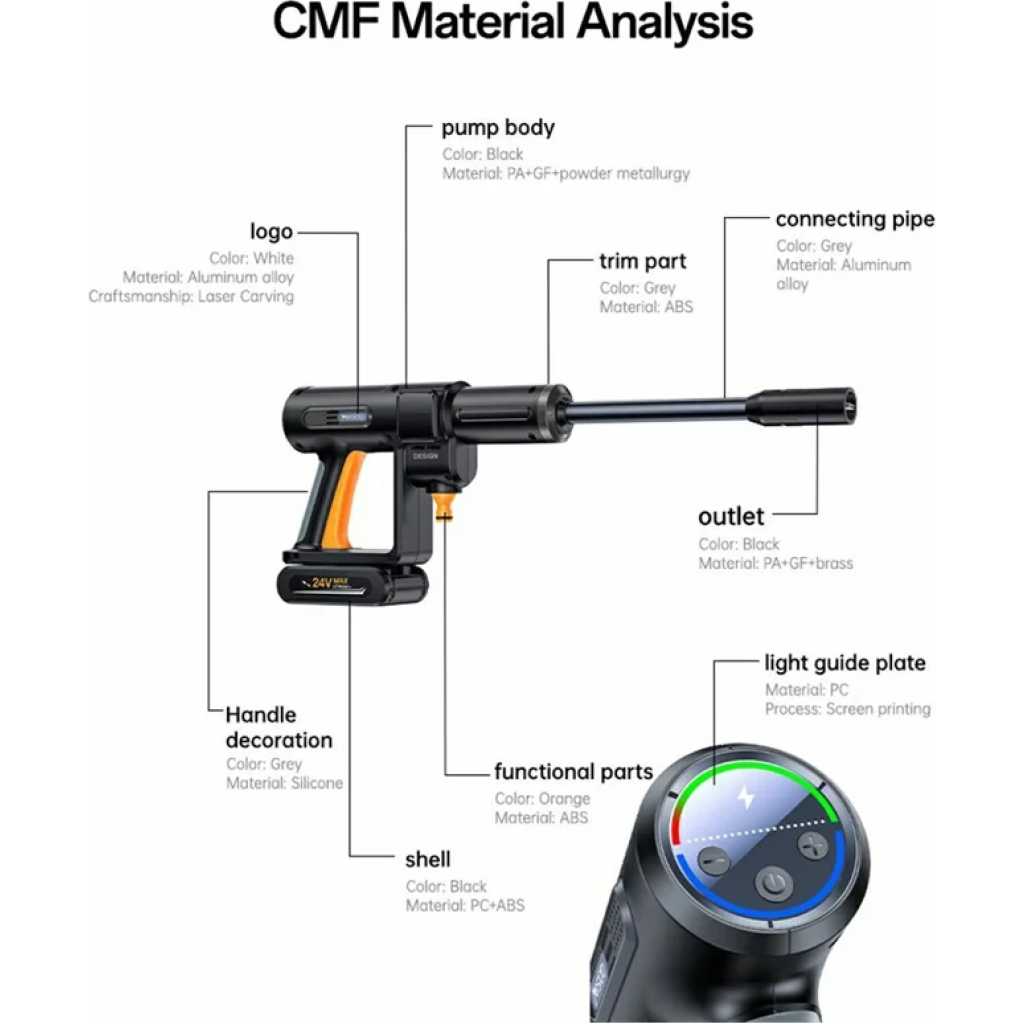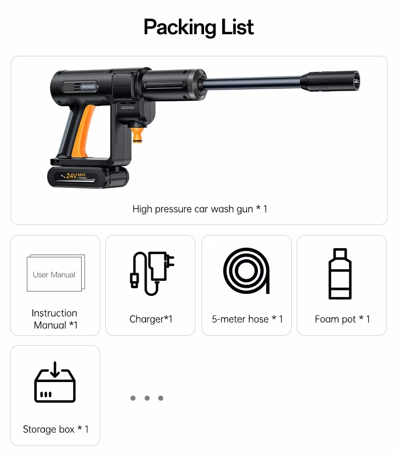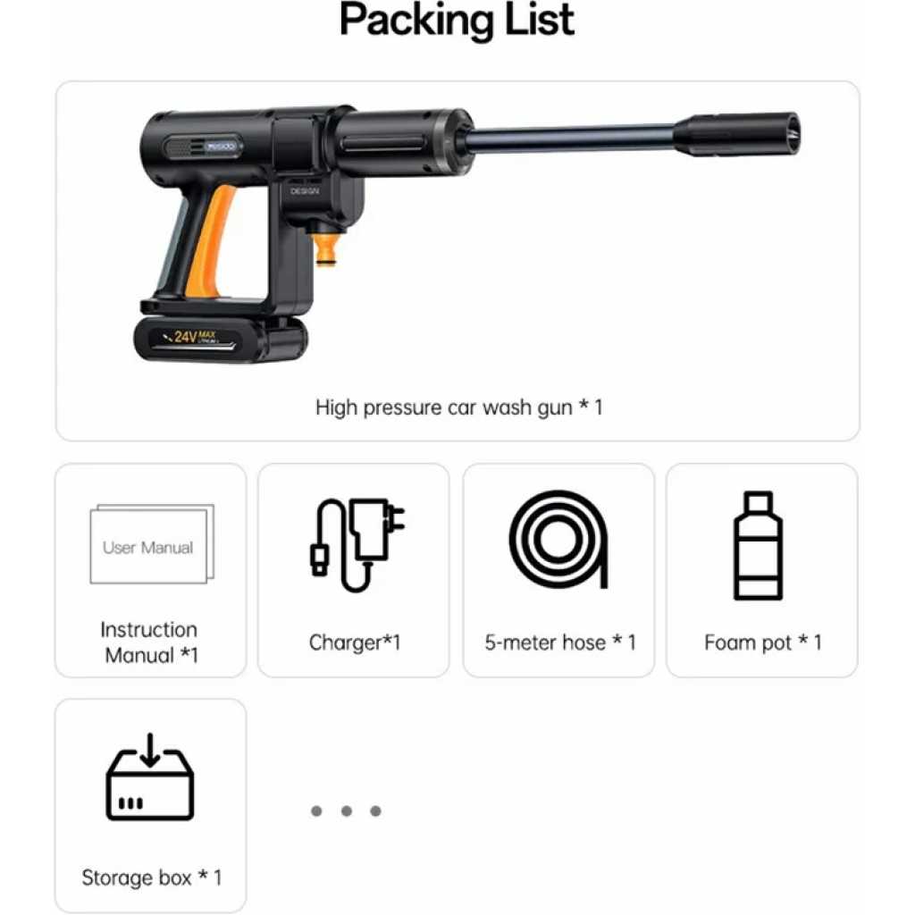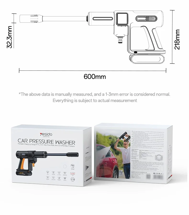 Key Features: 【Powerful Dual-Mode Cleaning】Second gear delivers 3.2MPa with 4L/min flow rate, while first gear offers 2.5MPa with 2.8L/min, suitable for various cleaning tasks. 【Long-lasting Battery Performance】Equipped with a 12000mAh lithium battery pack, providing up to 40 minutes of continuous use in low-pressure mode and 20 minutes in high-pressure mode. 【Smart PID Control System】Utilizes PID algorithm for motor control, ensuring stable water pressure and efficient operation. 【LED Display and Dual-Mode Adjustment】Clear LED screen shows battery level and pressure mode, easily adjustable between high and low settings for versatile cleaning. 【Versatile Nozzle Design】Rotatable nozzle offers both high-pressure jet and fan spray patterns, adaptable for various cleaning scenarios. 【Foam Bottle Attachment】Includes a foam bottle for generating thick foam, protecting car paint during washing. 【Cordless Convenience】Wireless design frees you from power cord constraints, allowing flexible use in multiple locations.
