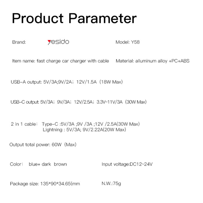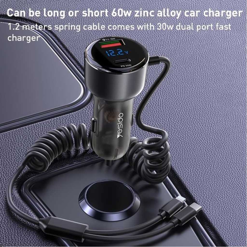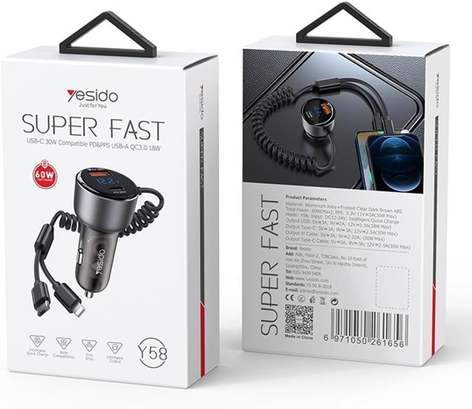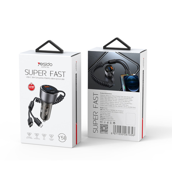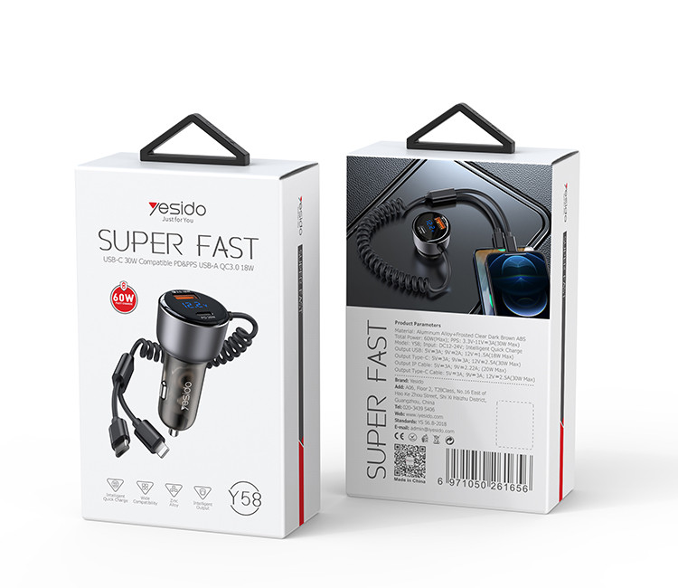 Y58 60W Fast Charging Car Charger | Built-in Type-C And Lightning cigarette lighting port charger