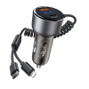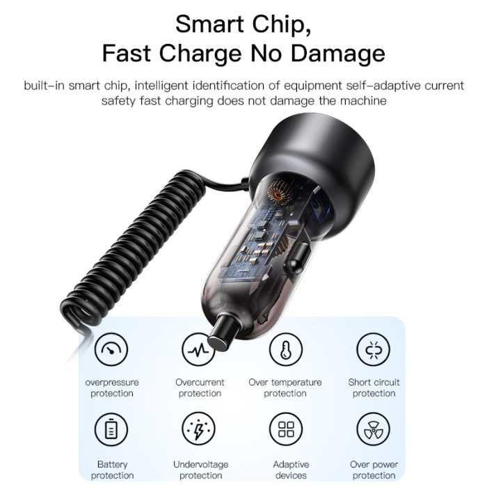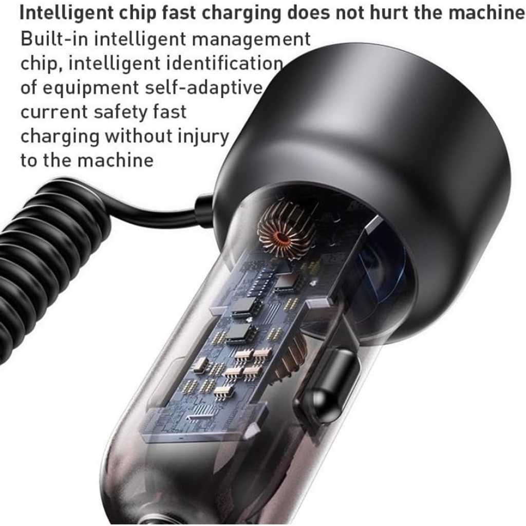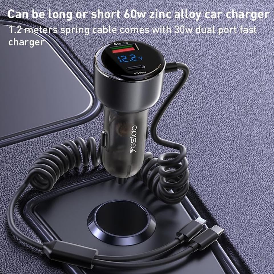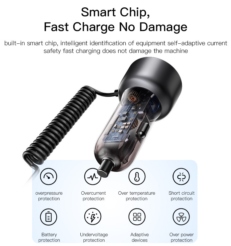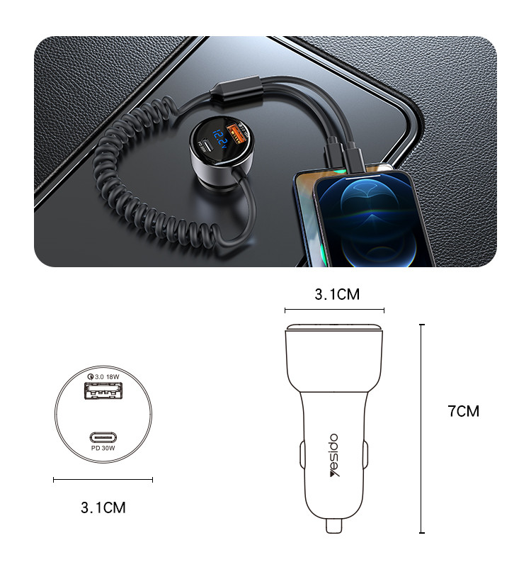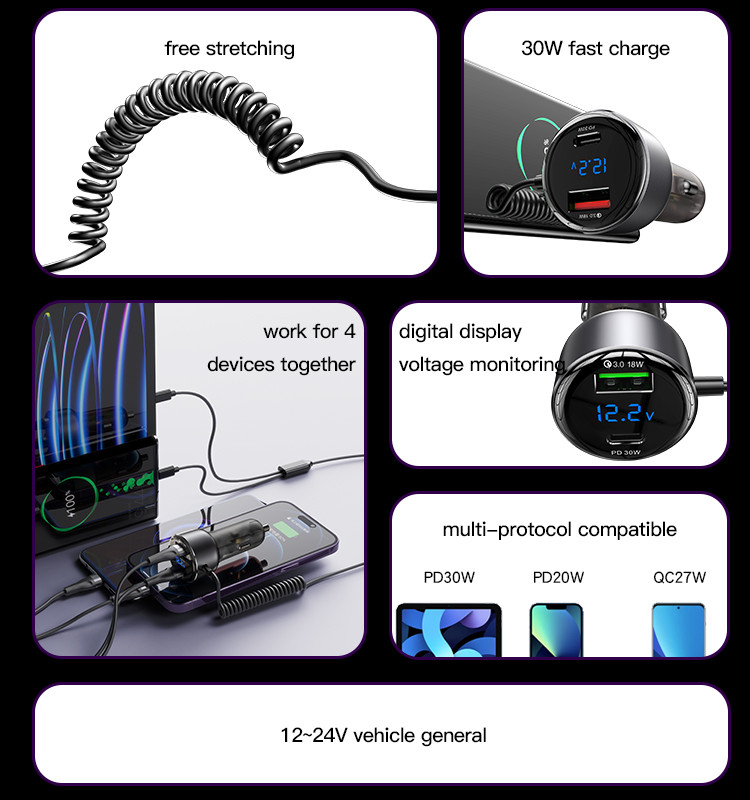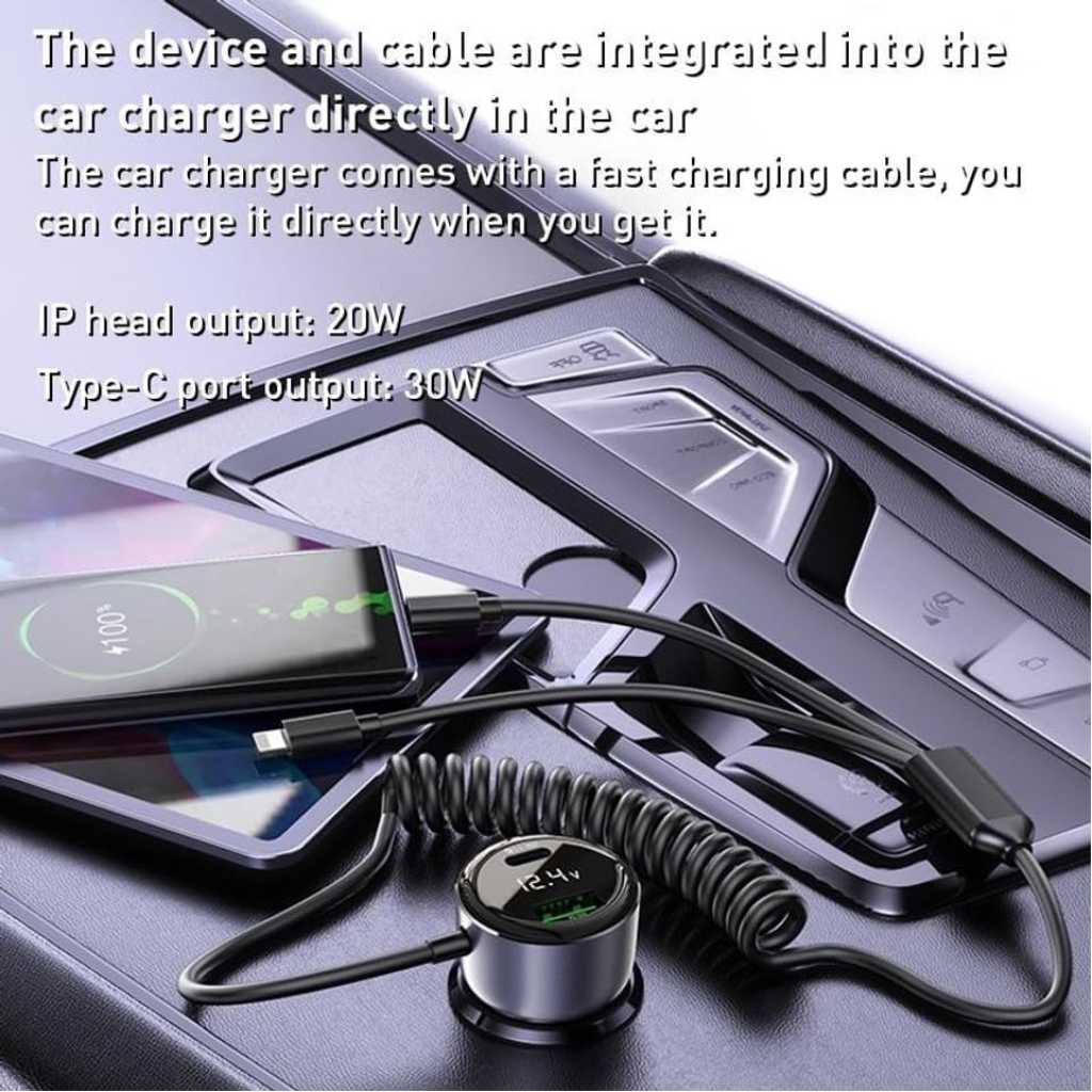 Key Features: Car charger with quick charge cable, direct charging, designed with iP/Type-C 2-in-1 Coiled Cable, and USB+USB-C Ports USB interface supports QC/AFC/SCP/FCP. Type-C port supports PD2.0/PD3.0/PPS/QC4.0 and other Android fast charging protocols Spring-loaded quick charge cable free retractable. High rebound TPU cable, max 120cm, automatic rebound Built-in smart chip, intelligent identification of equipment self-adaptive current safety fast charging do not damage the machine Spring design ofLED large screen display, automatic monitoring point bottle voltage real-time monitoring saferthe Lightning cable ensures durability and prevents tangling during use.