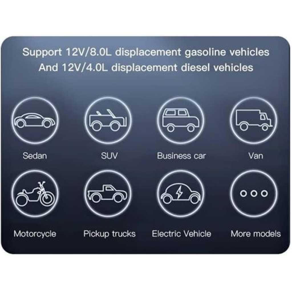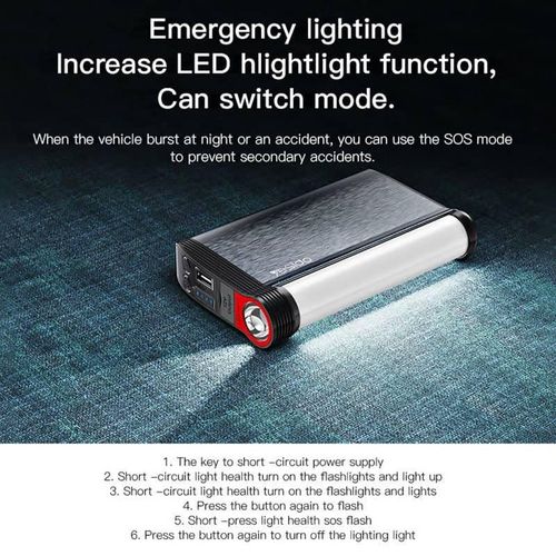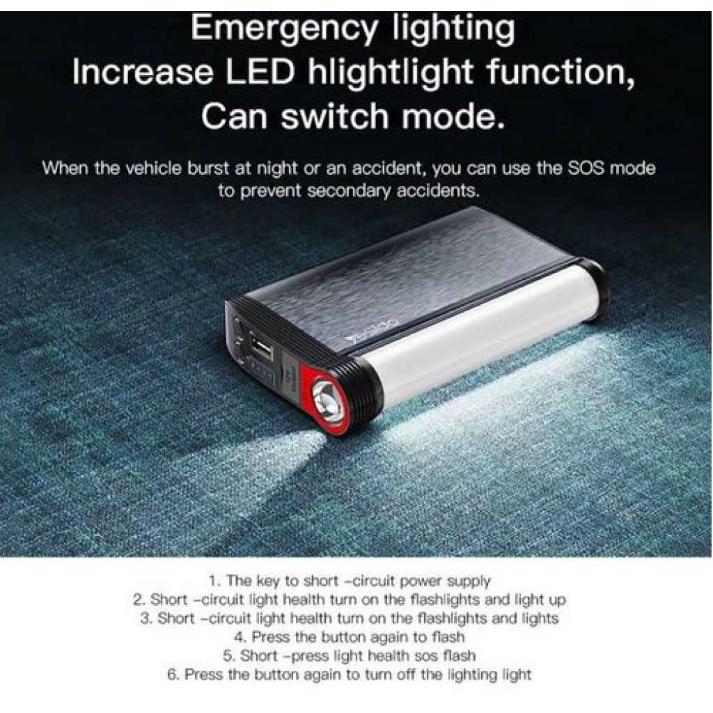 Key Features: Yesido YP36 Emergency Jump Starter 10000mAH Power Bank Car- Multicolor 10,000 mAh battery for diesel and petrol cars with LED lighting Super Energy Air Car Jump Starter Power: 10000 mAh. Product Type: Super Energy Air Jump Starter / Power Bank – 10000mAh Input (Type C): 5V-2.4A. Output (USB): 5V – 2.4A. LED emergency light and night light with four light modes (strong/weak)/flashlight/flash/SOS emergency The lighting power is 6 watts to give a wide light and flash Flashlight: 2W. Low energy use Long battery life and ease of use even when only 25% power remains Starting current: 12V/350A up (450A max) Battery charging time with electrolyte: about 4.5 hours for 5V-2.4A. Gasoline cars with a capacity of 5.0 liters. Diesel vehicles with a capacity of 3.0 liters