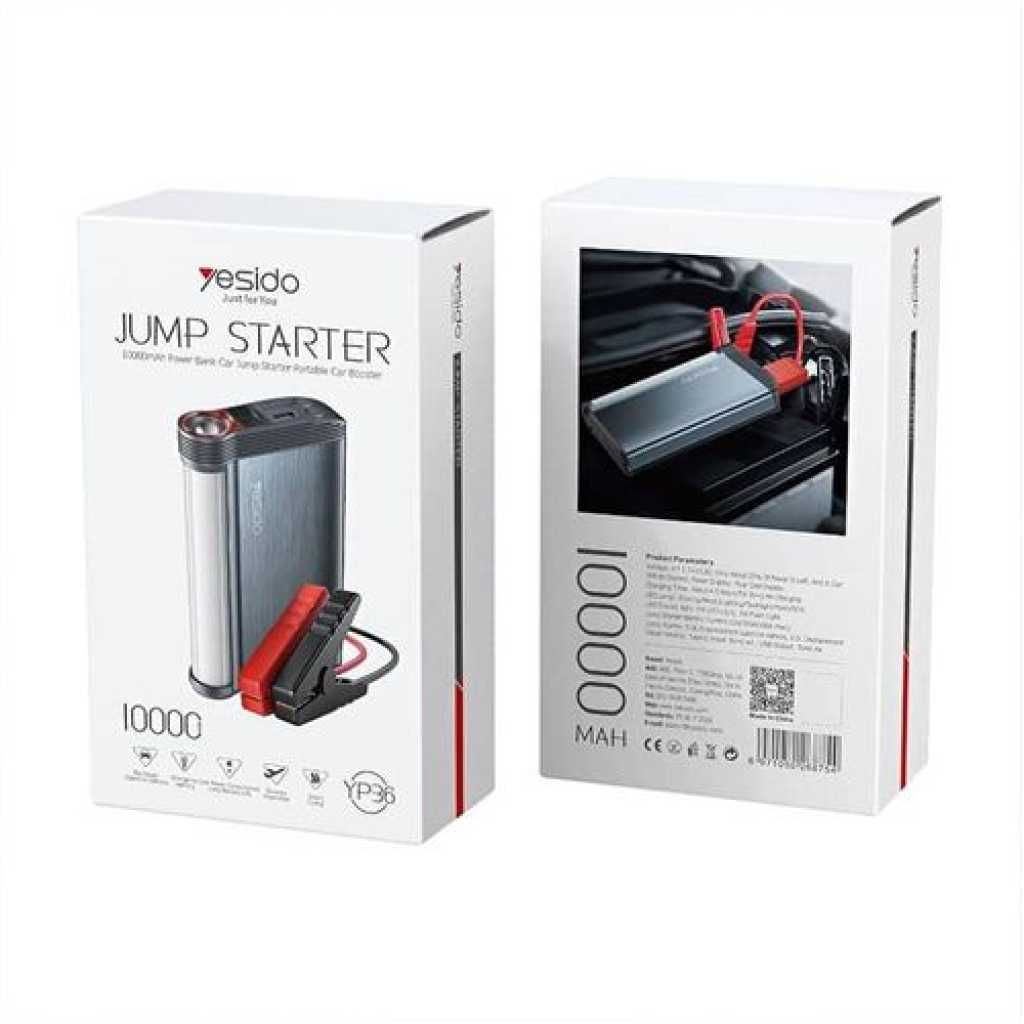 Yesido YP36 Emergency Jump Starter 10000mAH Power Bank Car- Multicolor Be Prepared for Any Roadside Emergency with the YESIDO YP36 – 10000mAh Portable Car Jump Starter. Key Features : Reliable Jump Starter : The YESIDO YP36 is a must-have for any car owner, featuring a robust 10000mAh capacity that can jump-start your vehicle with ease. Say goodbye to the stress of a dead battery and get back on the road quickly. Emergency LED Flashlight : Equipped with a powerful LED flashlight, the YP36 ensures you have illumination during emergencies, breakdowns, or low-light situations. It’s a versatile tool that can also come in handy for camping or outdoor activities. Positive and Negative Cables : The YP36 includes both positive and negative cables, making it straightforward to connect and jump-start your vehicle securely. No need to worry about complicated setups. Four-Grid Display : Stay informed about the power status of your jump starter with the convenient four-grid display. It provides real-time information about the remaining charge, so you’re always aware of its readiness. Fast Charging : With a quick 4-5 hour charging time, the YP36 ensures minimal downtime. It efficiently charges to ensure you’re always prepared for any unexpected situation. Durable Metal Interface : The YP36 features a robust metal interface that can withstand regular use. Its durability ensures a reliable connection every time you need it. Sleek Metal Grey Finish : The YP36 boasts an elegant metal grey finish that adds a touch of sophistication to your car accessories. It not only performs exceptionally well but also looks great. Additional USB Port : With an extra USB port, the YP36 doubles as a portable power bank, allowing you to charge your devices while on the go. It’s a versatile tool that keeps you connected no matter where you are. The YESIDO YP36 – 10000mAh Portable Car Jump Starter is your ultimate companion for road safety. Whether you need to jump-start your car, have emergency lighting, or charge your devices, this multifunctional tool has you covered. Stay prepared and confident on your journeys with the YESIDO YP36. What’s in the box 1 x YESIDO Jump Starter