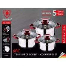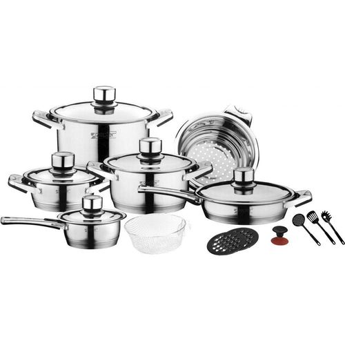 Key Features: Color : Silver Material: stainless steel. Cover material: heat resistant glass. Number of items in a set: 19 Bottom type: 5-layer. Measurement scale: yes. Handles fastening method: riveted connection. Handle type: hollow. Lid with a steam outlet: yes. Metal polishing: mirror / satin. Dishwasher safe: yes. K-gold plate knob and handle