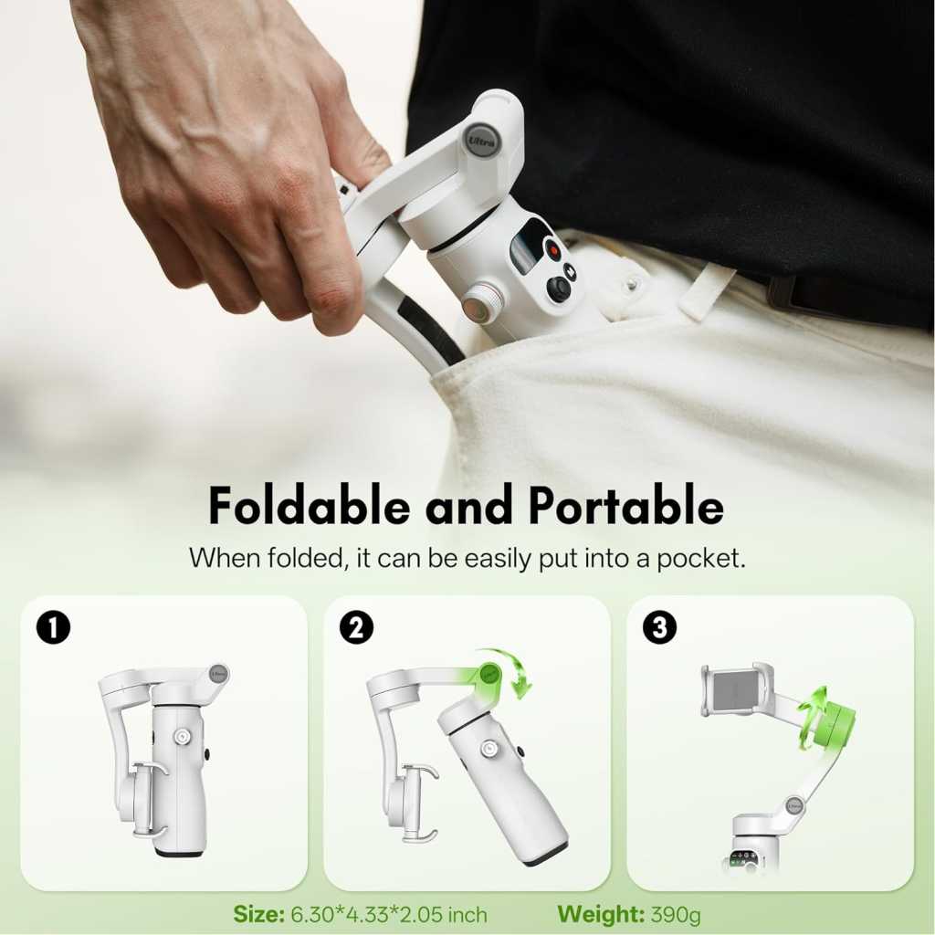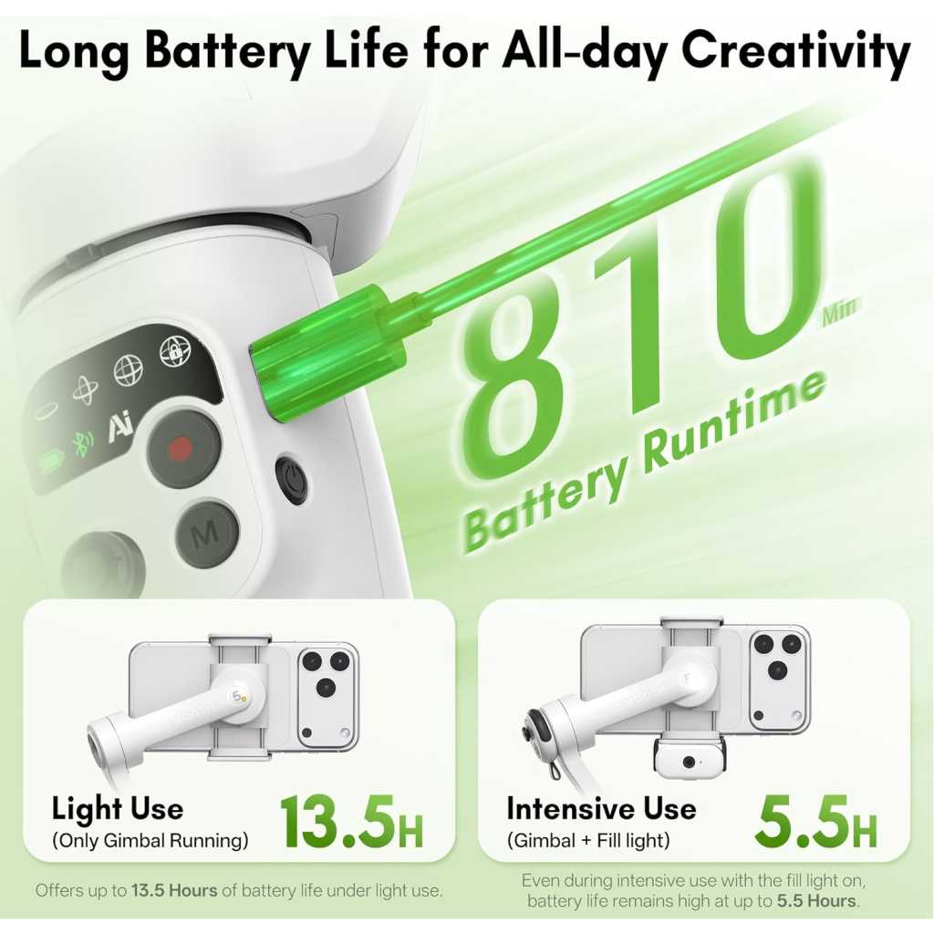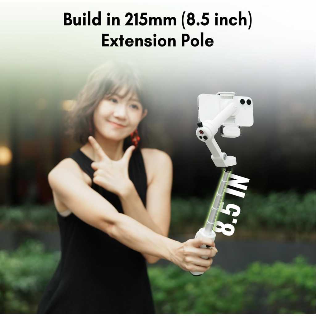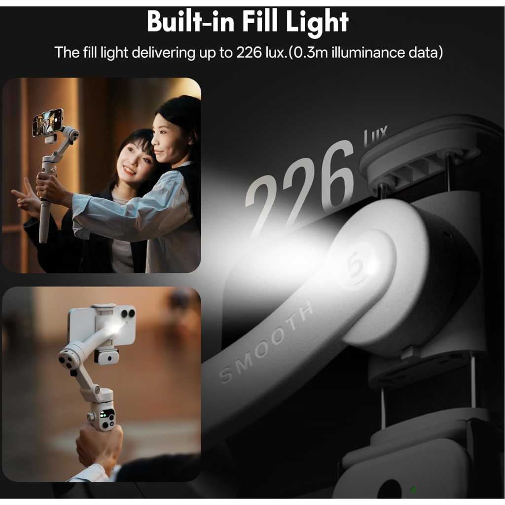 【Detachable Wireless Voice Remote Control】 The phone gimbal comes with a detachable wireless voice remote control, allowing for remote voice control of shooting within a 10-meter range. With voice control, simply say “Hey Cami” to activate the voice assistant and trigger photo taking, video recording, and other functions with simple commands. Even one person can easily handle follow-up shots, group photos, and complex camera movements. Ideal for outdoor shooting activities. 【Motion Sensing Control】 You no longer need to worry about fumbling for buttons to adjust the smartphone gimbal direction during shooting. The Smooth Q5 Ultra iphone gimbal supports motion control. Simply hold the voice remote, press and hold the joystick, and rotate your wrist to remotely control the gimbal’s direction, making the operation more immersive. 【AI Tracking】 The Smooth Q5 phone gimbal stabilizer introduces a brand-new AI tracking module, continuing its accurate multi-target recognition and tracking while optimizing the stability and accuracy of person tracking. You can even use a gesture to control taking photos or videos and customize the composition for tracking, enabling long-distance shooting. (The effective detection range of AI tracking is 5 meters, and the gesture control range is 0.5-3 meters). 【Built-in Extension Rod and Fill Light】 The phone video stabilizer features a built-in extendable extension rod, reaching up to 8.5 inches, allowing for easy group photos, wide-angle landscapes, and overhead shots without assistance. The arm incorporates a high-power fill light, providing 226 Lux of illumination to solve low-light shooting challenges. No need to carry additional fill lights or selfie sticks; one set meets diverse shooting needs. 【Foldable Storage】 The foldable design measures 6.3*4.3*2.05 inches when folded. It features a built-in storage slot, allowing it to easily fit into a backpack or pocket even when folded. Weighing only 390g, the gimbal for iphone is comfortable for extended handheld shooting. Say goodbye to bulky equipment and capture beautiful moments anytime, anywhere, whether traveling, hiking, at parties, or taking a casual stroll. 【Extremely Long Battery Life】 Under light use, the Smooth Q5 mobile gimbal boasts a battery life of up to 13.5 hours. With heavy use and a fill light on, the battery life can reach 5.5 hours, meeting your all-day creative needs. Compatible with most Android/iOS devices weighing between 170g and 300g.