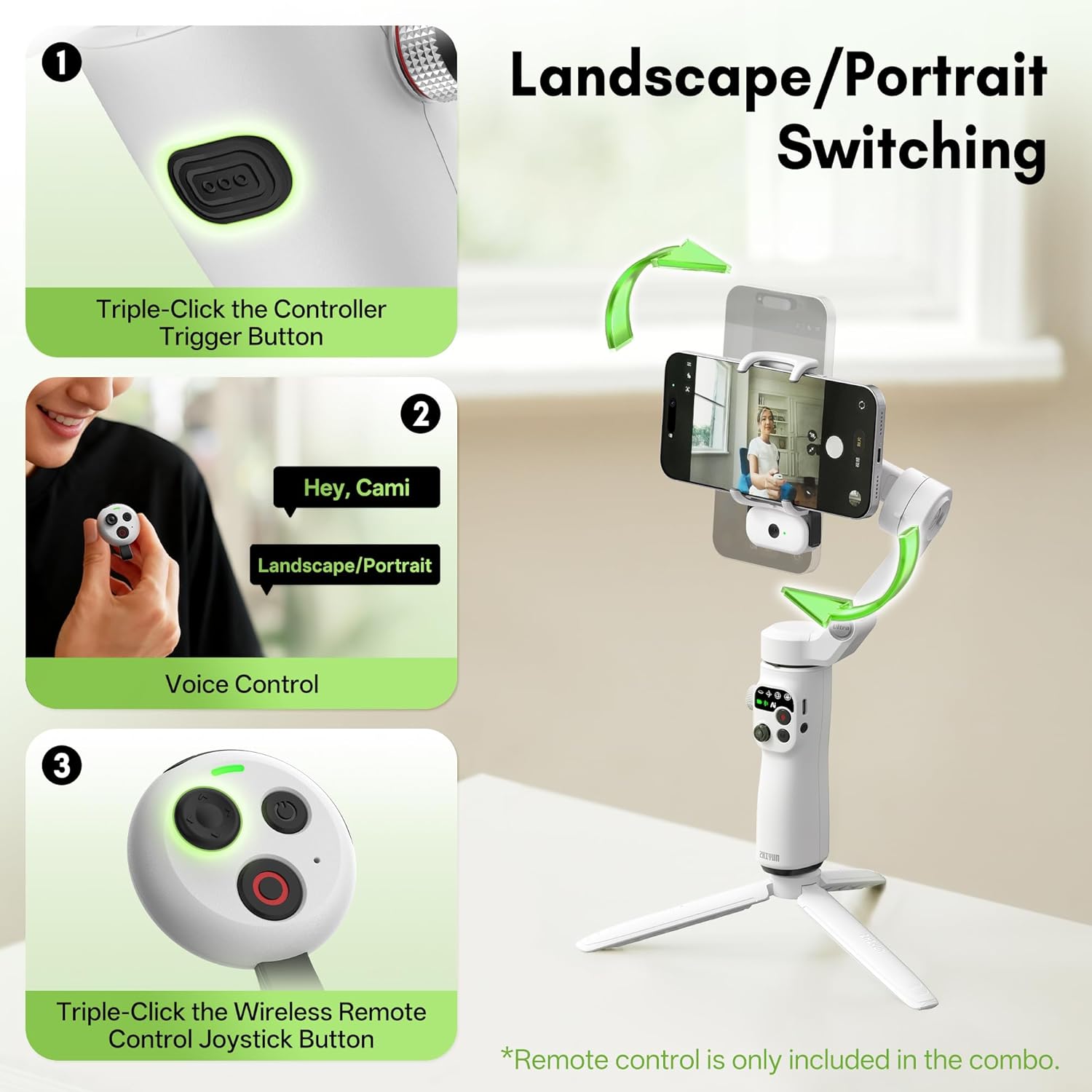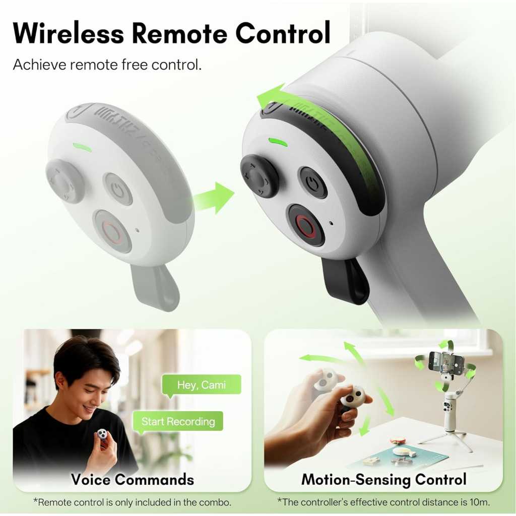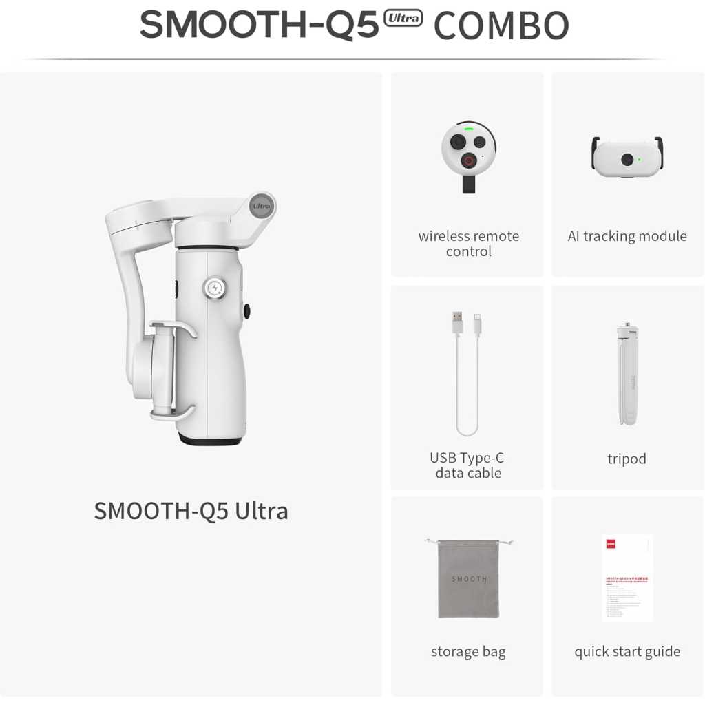 Key Features: 【Detachable Wireless Voice Remote Control】 The phone gimbal comes with a detachable wireless voice remote control, allowing for remote voice control of shooting within a 10-meter range. With voice control, simply say “Hey Cami” to activate the voice assistant and trigger photo taking, video recording, and other functions with simple commands. Even one person can easily handle follow-up shots, group photos, and complex camera movements. Ideal for outdoor shooting activities. 【Motion Sensing Control】 You no longer need to worry about fumbling for buttons to adjust the smartphone gimbal direction during shooting. The Smooth Q5 Ultra iphone gimbal supports motion control. Simply hold the voice remote, press and hold the joystick, and rotate your wrist to remotely control the gimbal’s direction, making the operation more immersive. 【AI Tracking】 The Smooth Q5 phone gimbal stabilizer introduces a brand-new AI tracking module, continuing its accurate multi-target recognition and tracking while optimizing the stability and accuracy of person tracking. You can even use a gesture to control taking photos or videos and customize the composition for tracking, enabling long-distance shooting. (The effective detection range of AI tracking is 5 meters, and the gesture control range is 0.5-3 meters). 【Built-in Extension Rod and Fill Light】 The phone video stabilizer features a built-in extendable extension rod, reaching up to 8.5 inches, allowing for easy group photos, wide-angle landscapes, and overhead shots without assistance. The arm incorporates a high-power fill light, providing 226 Lux of illumination to solve low-light shooting challenges. No need to carry additional fill lights or selfie sticks; one set meets diverse shooting needs. 【Foldable Storage】 The foldable design measures 6.3*4.3*2.05 inches when folded. It features a built-in storage slot, allowing it to easily fit into a backpack or pocket even when folded. Weighing only 390g, the gimbal for iphone is comfortable for extended handheld shooting. Say goodbye to bulky equipment and capture beautiful moments anytime, anywhere, whether traveling, hiking, at parties, or taking a casual stroll. 【Extremely Long Battery Life】 Under light use, the Smooth Q5 mobile gimbal boasts a battery life of up to 13.5 hours. With heavy use and a fill light on, the battery life can reach 5.5 hours, meeting your all-day creative needs. Compatible with most Android/iOS devices weighing between 170g and 300g.